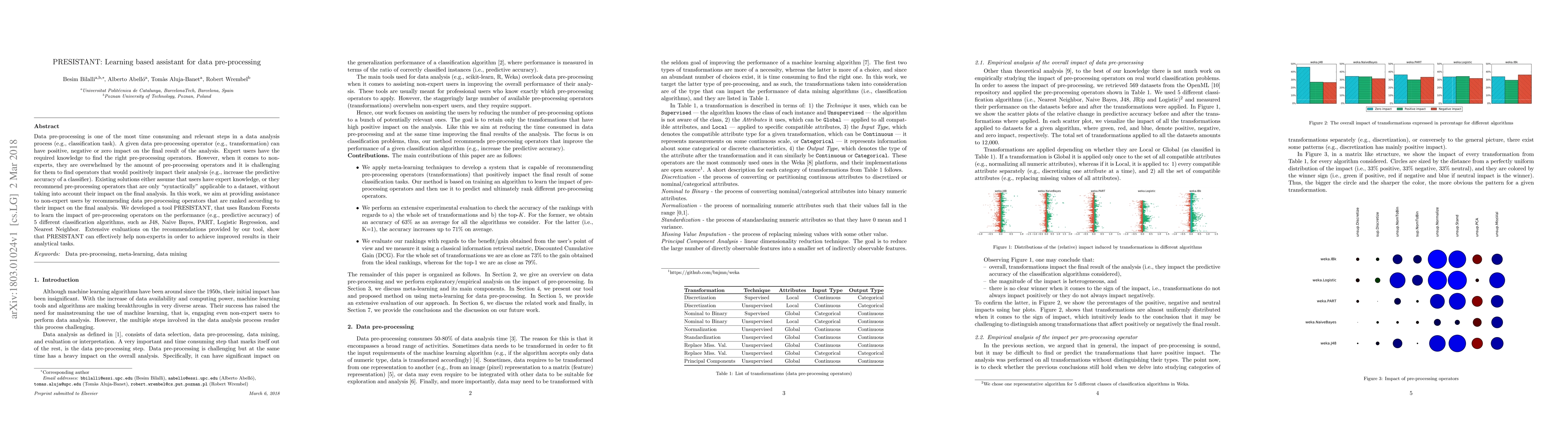 Data pre-processing is one of the most time consuming and relevant steps in a data analysis process (e.g., classification task). A given data pre-processing operator (e.g., transformation) can have positive, negative or zero impact on the final result of the analysis. Expert users have the required knowledge to find the right pre-processing operators. However, when it comes to non-experts, they are overwhelmed by the amount of pre-processing operators and it is challenging for them to find operators that would positively impact their analysis (e.g., increase the predictive accuracy of a classifier). Existing solutions either assume that users have expert knowledge, or they recommend pre-processing operators that are only "syntactically" applicable to a dataset, without taking into account their impact on the final analysis. In this work, we aim at providing assistance to non-expert users by recommending data pre-processing operators that are ranked according to their impact on the final analysis. We developed a tool PRESISTANT, that uses Random Forests to learn the impact of pre-processing operators on the performance (e.g., predictive accuracy) of 5 different classification algorithms, such as J48, Naive Bayes, PART, Logistic Regression, and Nearest Neighbor. Extensive evaluations on the recommendations provided by our tool, show that PRESISTANT can effectively help non-experts in order to achieve improved results in their analytical tasks.