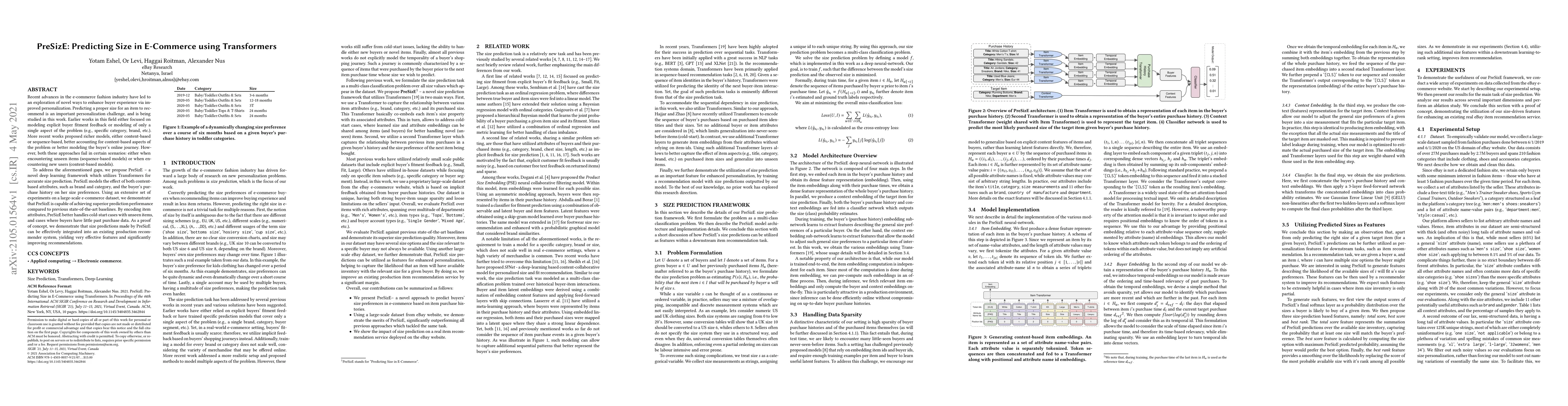 Recent advances in the e-commerce fashion industry have led to an exploration of novel ways to enhance buyer experience via improved personalization. Predicting a proper size for an item to recommend is an important personalization challenge, and is being studied in this work. Earlier works in this field either focused on modeling explicit buyer fitment feedback or modeling of only a single aspect of the problem (e.g., specific category, brand, etc.). More recent works proposed richer models, either content-based or sequence-based, better accounting for content-based aspects of the problem or better modeling the buyer's online journey. However, both these approaches fail in certain scenarios: either when encountering unseen items (sequence-based models) or when encountering new users (content-based models). To address the aforementioned gaps, we propose PreSizE - a novel deep learning framework which utilizes Transformers for accurate size prediction. PreSizE models the effect of both content-based attributes, such as brand and category, and the buyer's purchase history on her size preferences. Using an extensive set of experiments on a large-scale e-commerce dataset, we demonstrate that PreSizE is capable of achieving superior prediction performance compared to previous state-of-the-art baselines. By encoding item attributes, PreSizE better handles cold-start cases with unseen items, and cases where buyers have little past purchase data. As a proof of concept, we demonstrate that size predictions made by PreSizE can be effectively integrated into an existing production recommender system yielding very effective features and significantly improving recommendations.