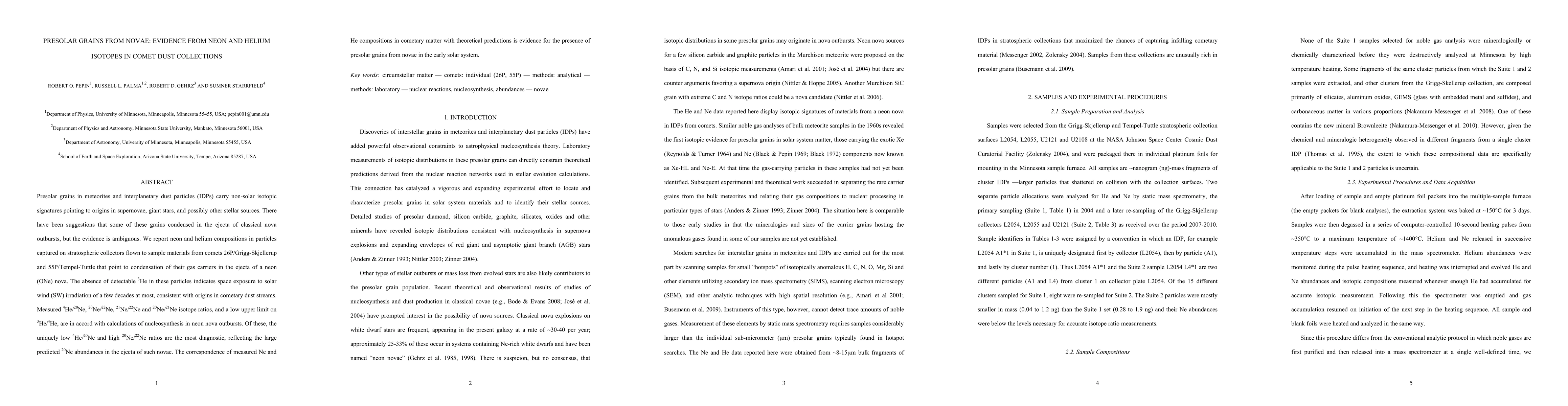 This research identifies presolar grains from neon (ONe) novae in cometary dust collected from comets 26P/Grigg-Skjellerup and 55P/Tempel-Tuttle, based on neon and helium isotopic compositions. The findings support the presence of these grains in the early solar system, with specific isotopic ratios matching theoretical predictions for nucleosynthesis in novae.