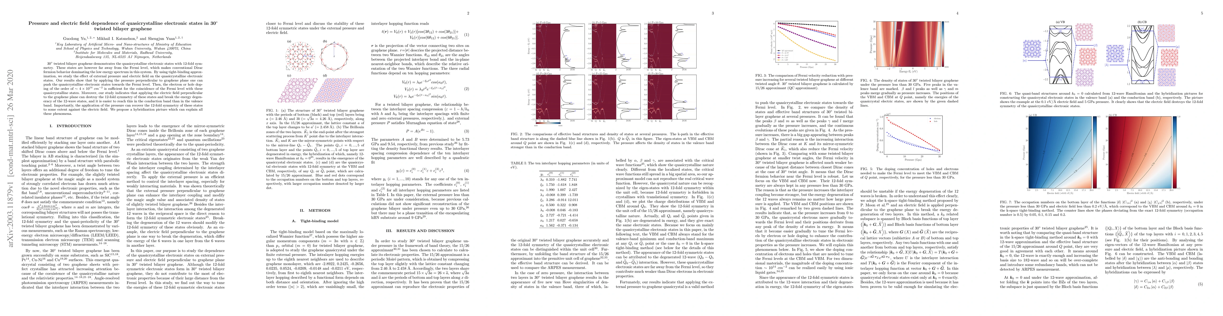 This paper investigates how external pressure and electric fields influence quasicrystalline electronic states in 30° twisted bilayer graphene, showing that pressure can bring these states near the Fermi level, while electric fields can disrupt their symmetry. The study proposes a hybridization model to explain these effects.