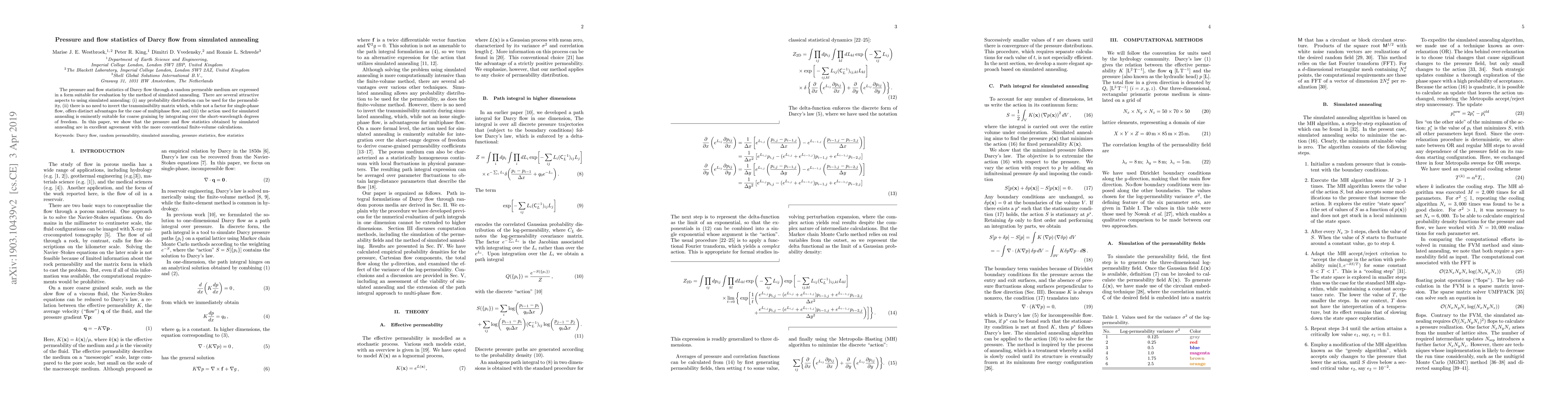 This paper investigates the pressure and flow statistics of Darcy flow through a random medium using simulated annealing, demonstrating its advantages over conventional methods, including flexibility in permeability distribution, avoidance of matrix inversion, and suitability for coarse graining. Results show excellent agreement with finite-volume calculations.