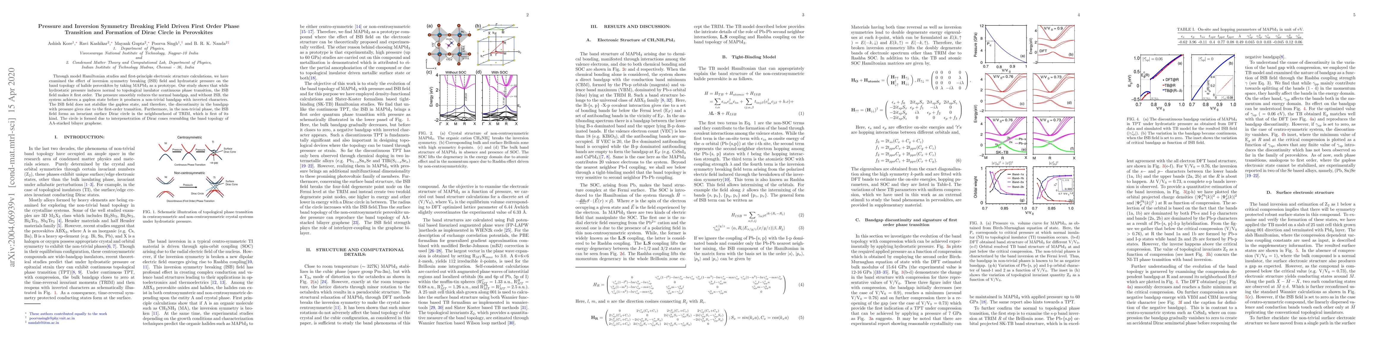 Through model Hamiltonian studies and first-principle electronic structure calculations, we have examined the effect of inversion symmetry breaking (ISB) field and hydrostatic pressure on the band topology of halide perovskites by taking MAPbI$_3$ as a prototype. Our study shows that while hydrostatic pressure induces normal to topological insulator continuous phase transition, the ISB field makes it first order. The pressure smoothly reduces the normal bandgap, and without ISB, the system achieves a gapless state before it produces a non-trivial bandgap with inverted characters. The ISB field does not stabilize the gapless state, and therefore, the discontinuity in the bandgap with pressure gives rise to the first-order transition. Furthermore, in the non-trivial phase, the ISB field forms an invariant surface Dirac circle in the neighbourhood of TRIM, which is first of its kind. The circle is formed due to interpenetration of Dirac cones resembling the band topology of AA-stacked bilayer graphene.