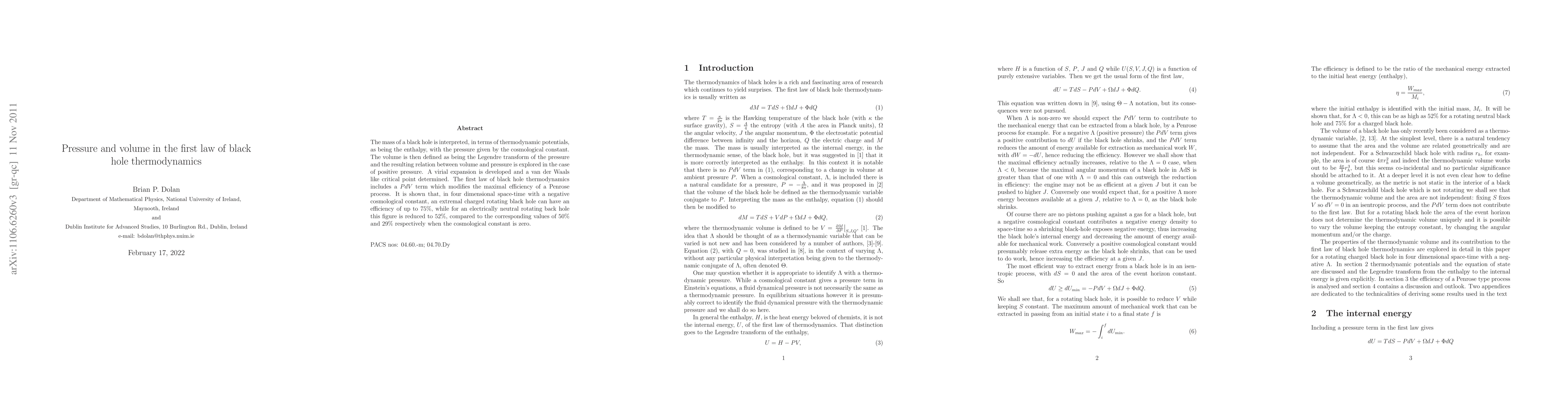 The mass of a black hole is interpreted, in terms of thermodynamic potentials, as being the enthalpy, with the pressure given by the cosmological constant. The volume is then defined as being the Legendre transform of the pressure and the resulting relation between volume and pressure is explored in the case of positive pressure. A virial expansion is developed and a van der Waals like critical point determined. The first law of black hole thermodynamics includes a PdV term which modifies the maximal efficiency of a Penrose process. It is shown that, in four dimensional space-time with a negative cosmological constant an extremal charged rotating black hole can have an efficiency of up to 75%, while for an electrically neutral rotating back hole this figure is reduced to 52%, compared to the corresponding values of 50% and 29% respectively when the cosmological constant is zero.