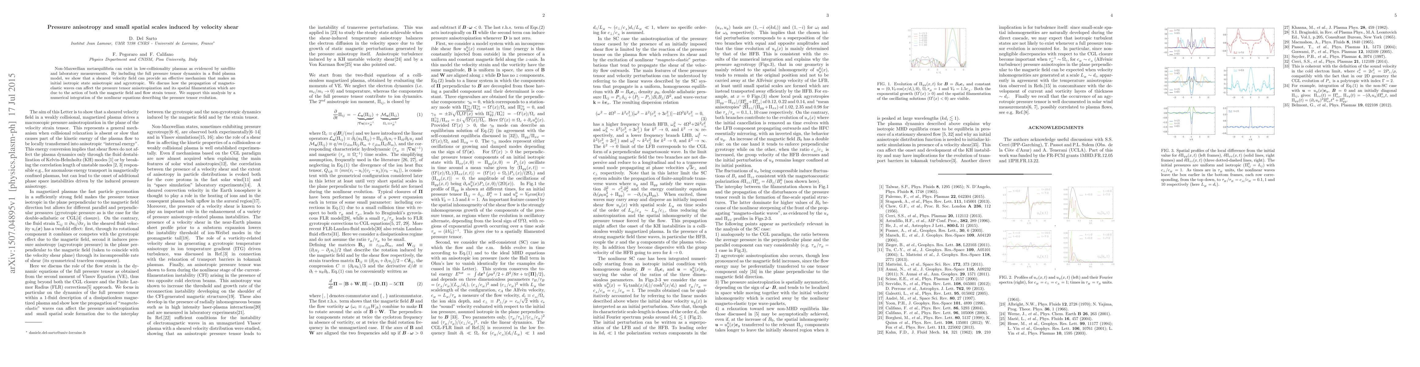 Non-Maxwellian metaequilibria can exist in low-collisionality plasmas as evidenced by satellite and laboratory measurements. By including the full pressure tensor dynamics in a fluid plasma model, we show that a sheared velocity field can provide an effective mechanism that makes an initial isotropic state anisotropic and agyrotropic. We discuss how the propagation of magneto-elastic waves can affect the pressure tensor anisotropization and its spatial filamentation which are due to the action of both the magnetic field and flow strain tensor. We support this analysis by a numerical integration of the nonlinear equations describing the pressure tensor evolution.