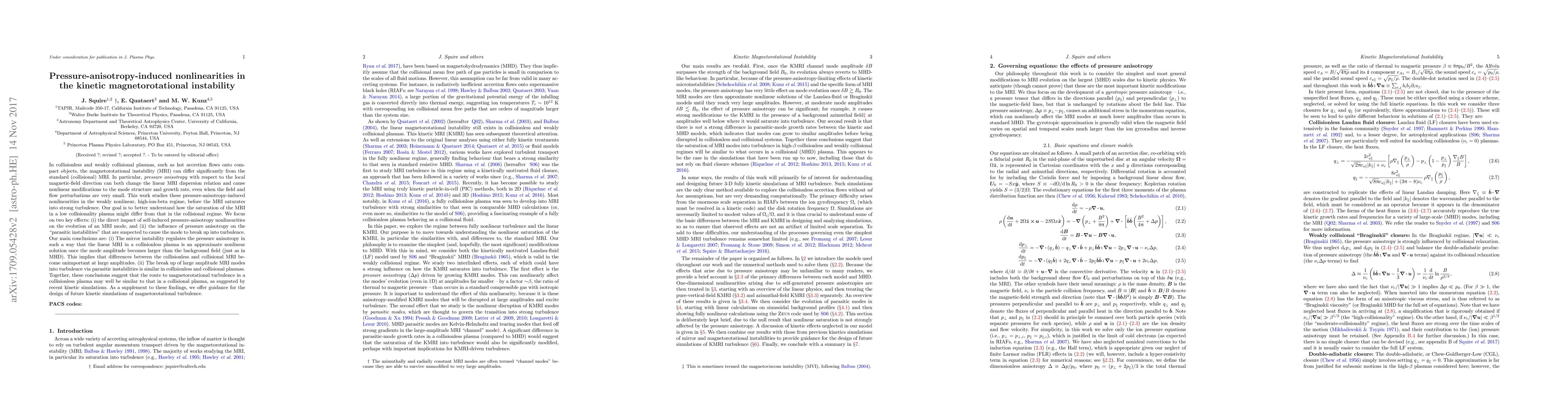 In collisionless and weakly collisional plasmas, such as hot accretion flows onto compact objects, the magnetorotational instability (MRI) can differ significantly from the standard (collisional) MRI. In particular, pressure anisotropy with respect to the local magnetic-field direction can both change the linear MRI dispersion relation and cause nonlinear modifications to the mode structure and growth rate, even when the field and flow perturbations are small. This work studies these pressure-anisotropy-induced nonlinearities in the weakly nonlinear, high-ion-beta regime, before the MRI saturates into strong turbulence. Our goal is to better understand how the saturation of the MRI in a low collisionality plasma might differ from that in the collisional regime. We focus on two key effects: (i) the direct impact of self-induced pressure-anisotropy nonlinearities on the evolution of an MRI mode, and (ii) the influence of pressure anisotropy on the "parasitic instabilities" that are suspected to cause the mode to break up into turbulence. Our main conclusions are: (i) The mirror instability regulates the pressure anisotropy in such a way that the linear MRI in a collisionless plasma is an approximate nonlinear solution once the mode amplitude becomes larger than the background field (just as in MHD). This implies that differences between the collisionless and collisional MRI become unimportant at large amplitudes. (ii) The break up of large amplitude MRI modes into turbulence via parasitic instabilities is similar in collisionless and collisional plasmas. Together, these conclusions suggest that the route to magnetorotational turbulence in a collisionless plasma may well be similar to that in a collisional plasma, as suggested by recent kinetic simulations. As a supplement to these findings, we offer guidance for the design of future kinetic simulations of magnetorotational turbulence.