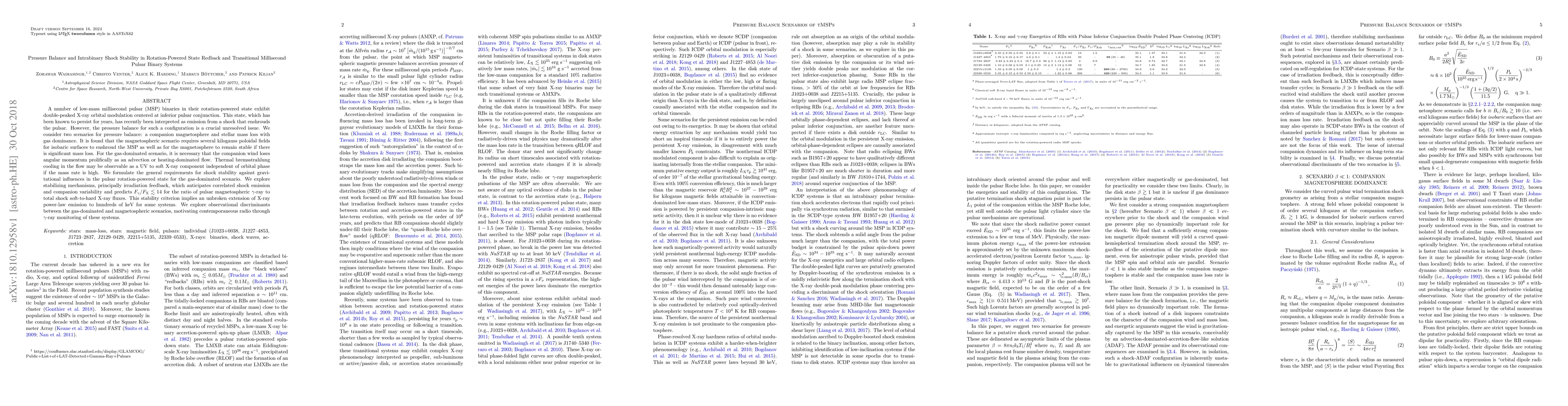 A number of low-mass millisecond pulsar (MSP) binaries in their rotation-powered state exhibit double-peaked X-ray orbital modulation centered at inferior pulsar conjunction. This state, which has been known to persist for years, has recently been interpreted as emission from a shock that enshrouds the pulsar. However, the pressure balance for such a configuration is a crucial unresolved issue. We consider two scenarios for pressure balance: a companion magnetosphere and stellar mass loss with gas dominance. It is found that the magnetospheric scenario requires several kilogauss poloidal fields for isobaric surfaces to enshroud the MSP as well as for the magnetosphere to remain stable if there is significant mass loss. For the gas-dominated scenario, it is necessary that the companion wind loses angular momentum prolifically as an advection or heating-dominated flow. Thermal bremsstrahlung cooling in the flow may be observable as a UV to soft X-ray component independent of orbital phase if the mass rate is high. We formulate the general requirements for shock stability against gravitational influences in the pulsar rotation-powered state for the gas-dominated scenario. We explore stabilizing mechanisms, principally irradiation feedback, which anticipates correlated shock emission and companion variability and predicts $ F_\gamma/F_{\rm X} \lesssim 14$ for the ratio of pulsar magnetospheric $\gamma$-ray to total shock soft-to-hard X-ray fluxes. This stability criterion implies an unbroken extension of X-ray power-law emission to hundreds of keV for some systems. We explore observational discriminants between the gas-dominated and magnetospheric scenarios, motivating contemporaneous radio through $\gamma$-ray monitoring of these systems.