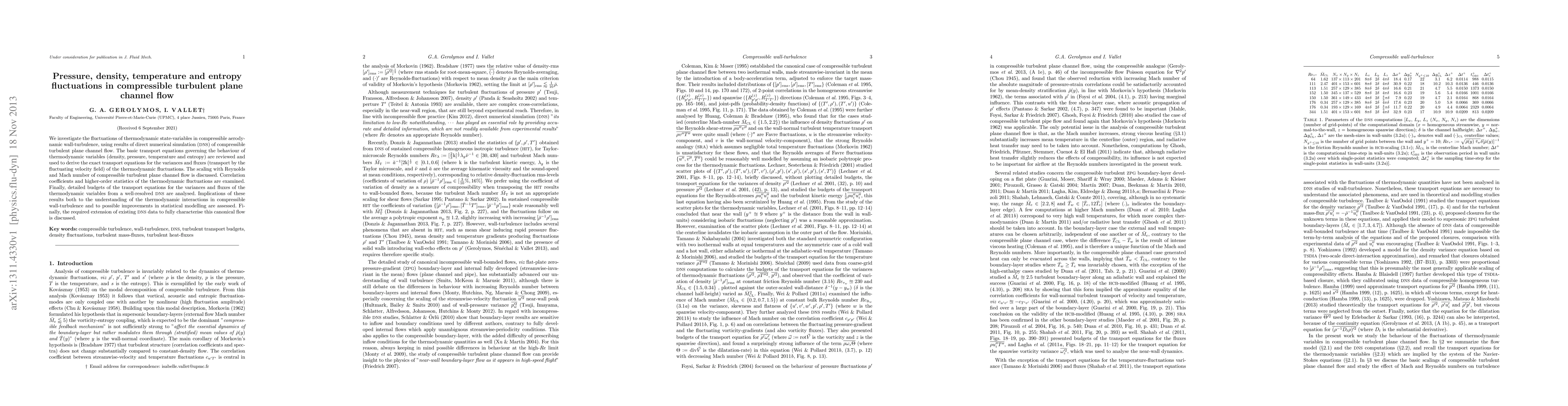 We investigate the fluctuations of thermodynamic state-variables in compressible aerodynamic wall-turbulence, using results of direct numerical simulation (DNS) of compressible turbulent plane channel flow. The basic transport equations governing the behaviour of thermodynamic variables (density, pressure, temperature and entropy) are reviewed and used to derive the exact transport equations for the variances and fluxes (transport by the fluctuating velocity field) of the thermodynamic fluctuations. The scaling with Reynolds and Mach number of compressible turbulent plane channel flow is discussed. Correlation coefficients and higher-order statistics of the thermodynamic fluctuations are examined. Finally, detailed budgets of the transport equations for the variances and fluxes of the thermodynamic variables from a well-resolved DNS are analysed. Implications of these results both to the understanding of the thermodynamic interactions in compressible wall-turbulence and to possible improvements in statistical modelling are assessed. Finally, the required extension of existing DNS data to fully characterise this canonical flow is discussed.