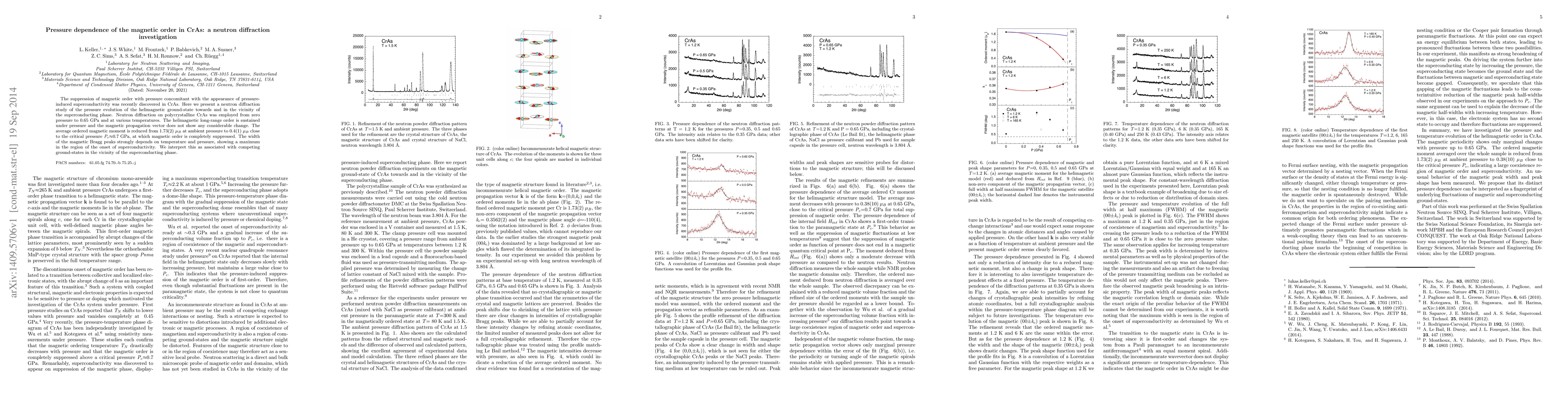 This study investigates the pressure-induced changes in the magnetic order of CrAs using neutron diffraction, revealing that while the helimagnetic state persists under pressure, the ordered magnetic moment decreases significantly, ultimately vanishing near 0.7 GPa, correlating with the onset of superconductivity.