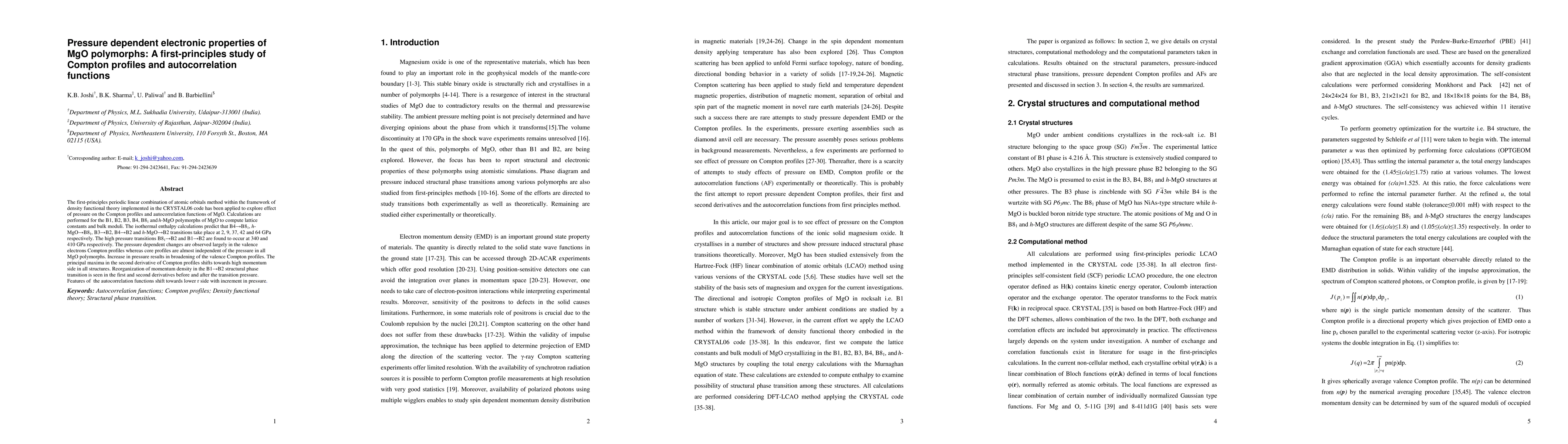This study uses first-principles calculations to investigate the pressure-dependent electronic properties of various MgO polymorphs, revealing significant changes in valence electron Compton profiles and shifts in momentum density under high pressure, while core profiles remain largely unaffected. Transitions between polymorphs are predicted to occur at specific pressure thresholds, with notable reorganization observed in the B1 to B2 phase transition.