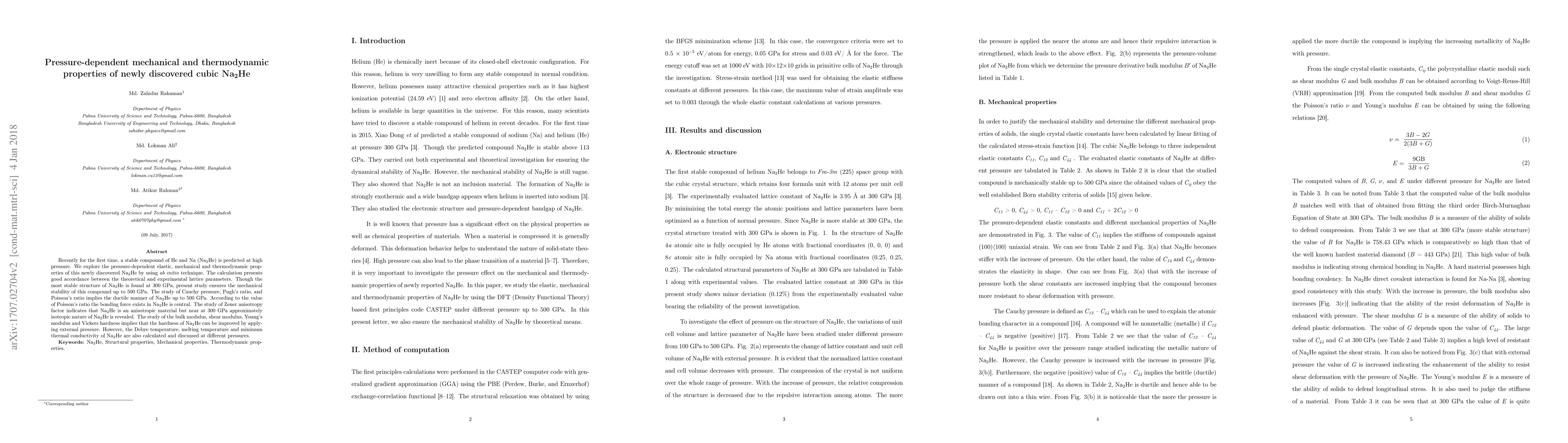This study investigates the pressure-dependent elastic, mechanical, and thermodynamic properties of the newly discovered compound Na2He using ab initio techniques. The findings confirm the mechanical stability of Na2He up to 500 GPa, while also calculating its Debye, melting temperatures, and thermal conductivity.