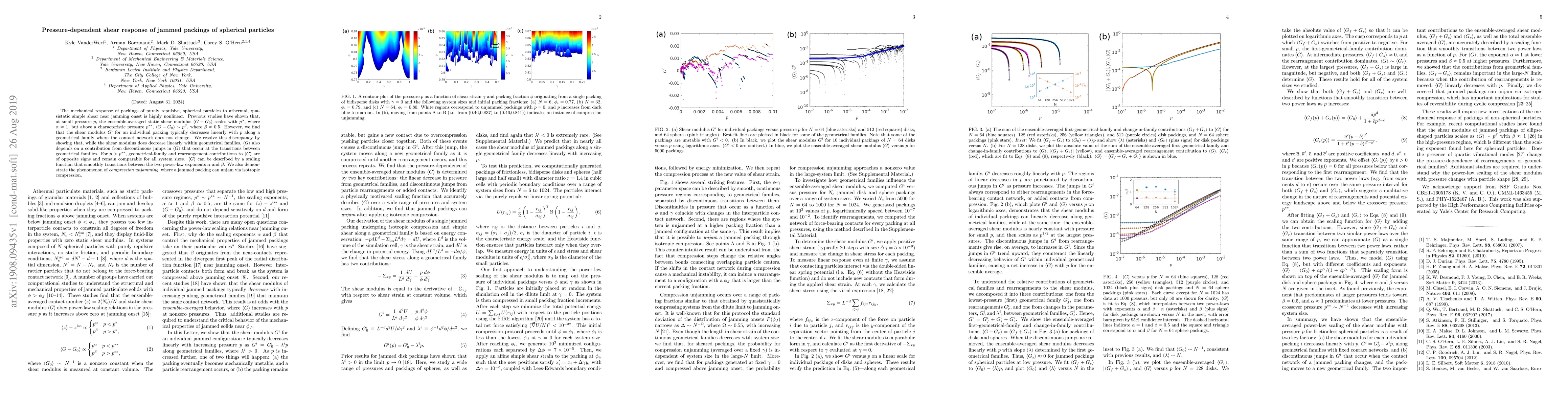 Researchers study the mechanical response of jammed packings of spherical particles under pressure-dependent shear, finding that individual packings exhibit a linear decrease in shear modulus with pressure, but ensemble-averaged behavior deviates from this due to discontinuous jumps at transitions between geometrical families.