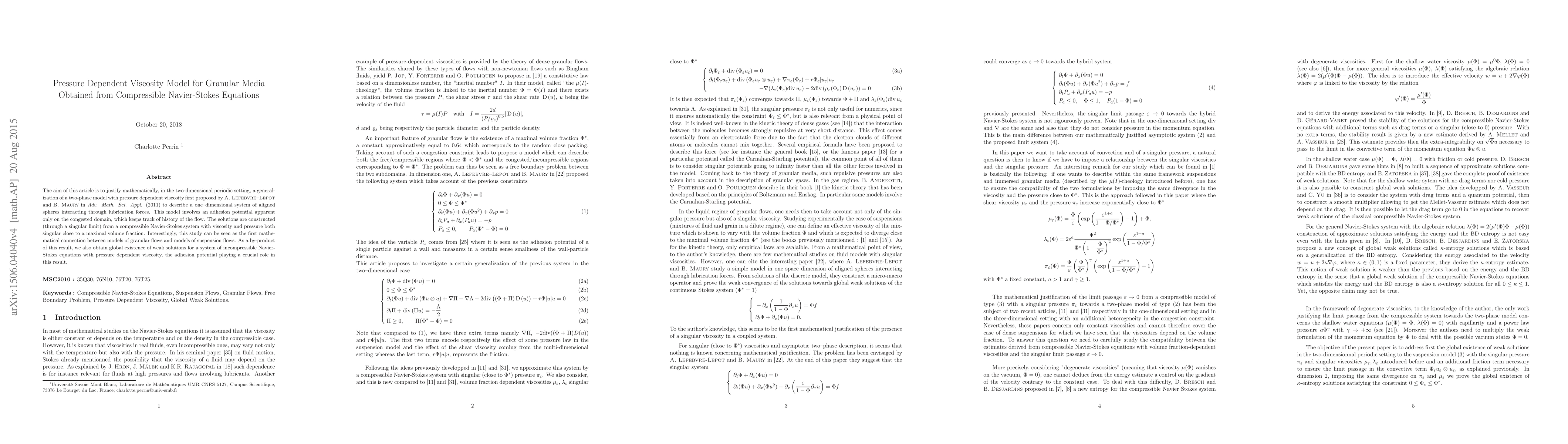 Researchers developed a pressure-dependent viscosity model for granular media based on compressible Navier-Stokes equations, linking granular flows to suspension models and showing global existence of weak solutions for incompressible Navier-Stokes equations.