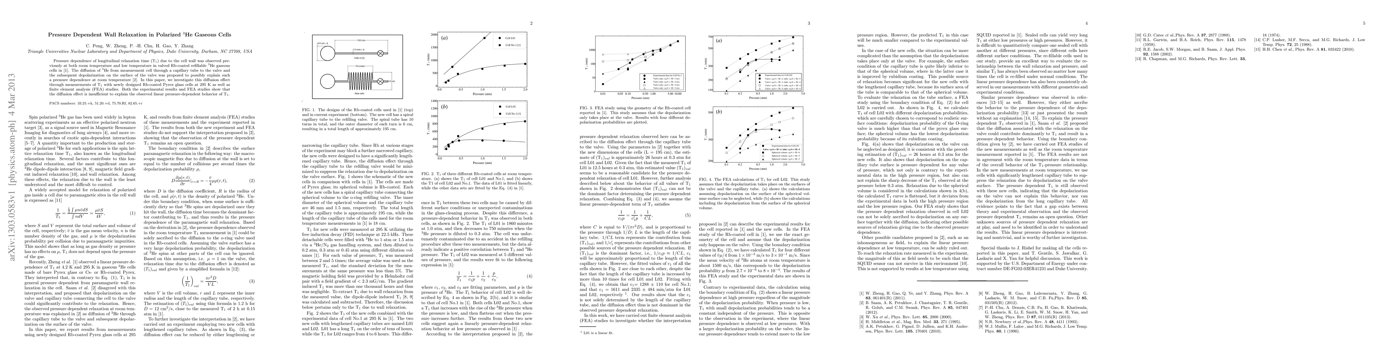 Pressure dependence of longitudinal relaxation time (T$_1$) due to the cell wall was observed previously at both room temperature and low temperature in valved Rb-coated refillable $^3$He gaseous cells in \cite{Zheng2}. The diffusion of $^3$He from measurement cell through a capillary tube to the valve and the subsequent depolarization on the surface of the valve was proposed to possibly explain such a pressure dependence at room temperature \cite{Saam}. In this paper, we investigate this diffusion effect through measurements of T$_1$ with newly designed Rb-coated Pyrex glass cells at 295 K as well as finite element analysis (FEA) studies. Both the experimental results and FEA studies show that the diffusion effect is insufficient to explain the observed linear pressure-dependent behavior of T$_1$.