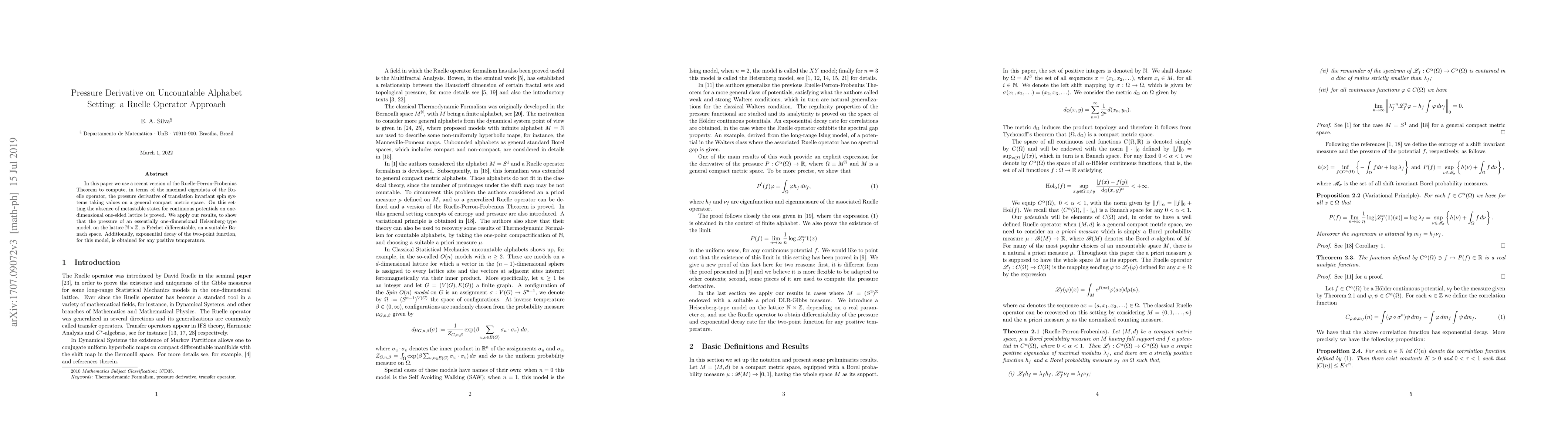 This paper utilizes a Ruelle operator and the Ruelle-Perron-Frobenius Theorem to determine the pressure derivative of translation invariant spin systems on a general compact metric space, proving the absence of metastable states for continuous potentials on a one-dimensional lattice. It also demonstrates Fréchet differentiability of the pressure for a one-dimensional Heisenberg-type model and exponential decay of the two-point function at any positive temperature.