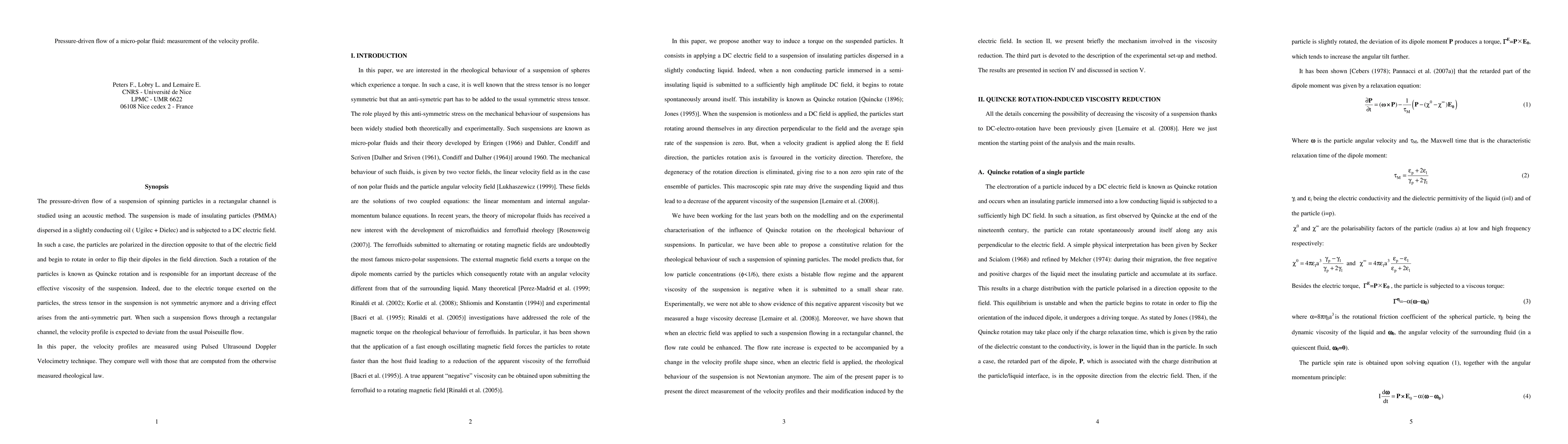 This paper investigates the pressure-driven flow of a micro-polar fluid composed of spinning particles in a rectangular channel, measuring velocity profiles using Pulsed Ultrasound Doppler Velocimetry. The study reveals deviations from typical Poiseuille flow due to Quincke rotation induced by a DC electric field.