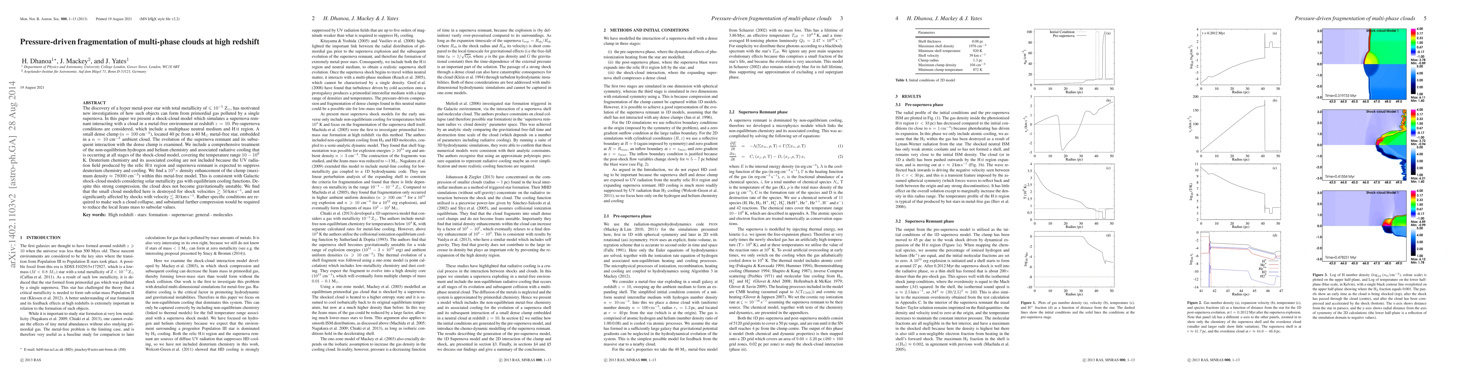 The discovery of a hyper metal-poor star with total metallicity of $\le 10^{-5}$ Z$_\odot$, has motivated new investigations of how such objects can form from primordial gas polluted by a single supernova. In this paper we present a shock-cloud model which simulates a supernova remnant interacting with a cloud in a metal-free environment at redshift $z=10$. Pre-supernova conditions are considered, which include a multiphase neutral medium and H II region. A small dense clump ($n=100$ cm$^{-3}$), located 40 pc from a 40 M$_\odot$ metal-free star, embedded in a $n=10$ cm$^{-3}$ ambient cloud. The evolution of the supernova remnant (explosion energy $10^{52}$ erg) and its subsequent interaction with the dense clump is examined. This is the first study to include a comprehensive treatment of the non-equilibrium chemistry and associated radiative cooling that is occurring at all stages of the shock-cloud model. We have included a primordial chemistry network that covers the temperature range $10-10^9$ K, and is coupled to thermal models of atomic & molecular cooling. We find $\times10^{3}$ density enhancement of the clump (i.e maximum density $\sim 78000$ cm$^{-3}$) within this metal-free model. This is consistent with Galactic shock-cloud models considering solar metallicity gas with equilibrium cooling functions. Despite this strong compression, the cloud does not become gravitationally unstable. We find that the small cloud modelled here is destroyed for shock velocities $\gtrsim 50\,$km s$^{-1}$, and not significantly affected by shocks with velocity $\lesssim 30\,$km s$^{-1}$. Rather specific conditions are required to make such a cloud collapse.