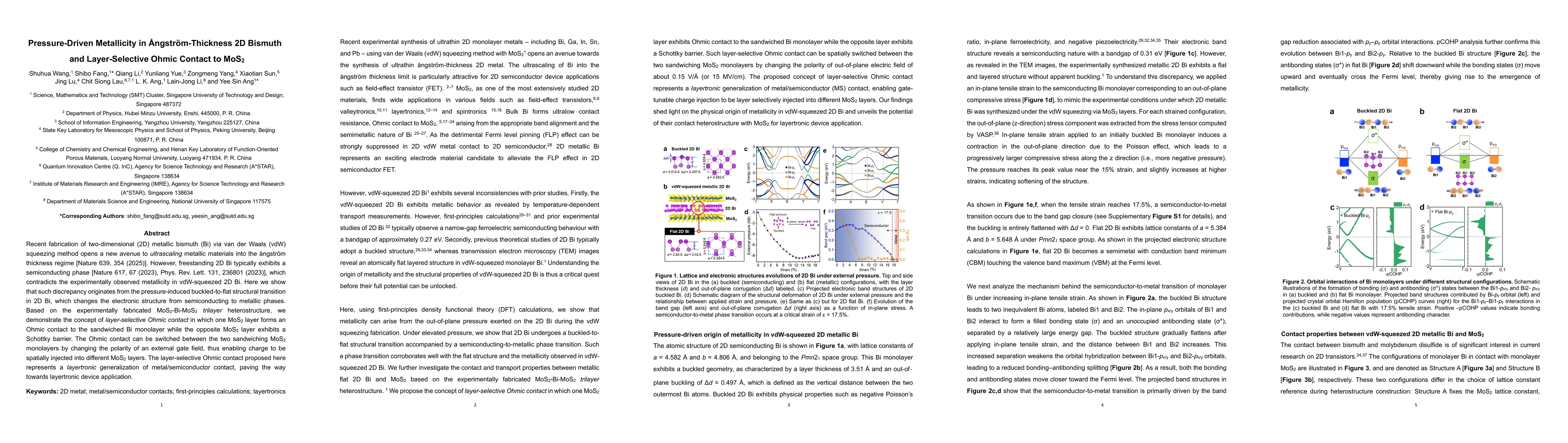 The main technical contribution lies in the understanding of pressure-driven metallicity in Ångström-thickness 2D Bi and the realization of layer-selective Ohmic contact in MoS2-Bi-MoS2 trilayer heterostructures.