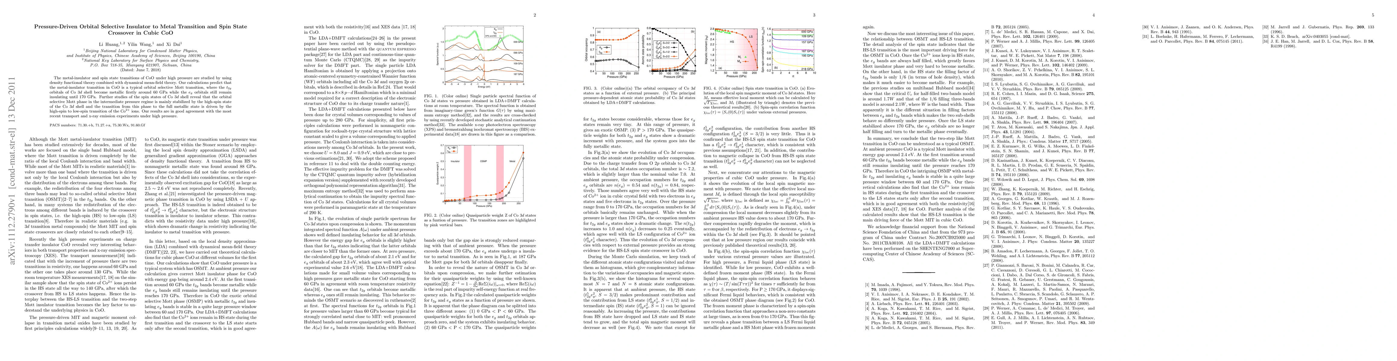 This paper investigates the pressure-induced metal-insulator transition and spin state crossover in cubic CoO using density functional theory and dynamical mean-field theory. It finds that the $t_{2g}$ orbitals become metallic first at 60 GPa, while $e_g$ orbitals remain insulating until 170 GPa, and the transition is driven by a high-spin to low-spin state change in Co$^{2+}$ ions.