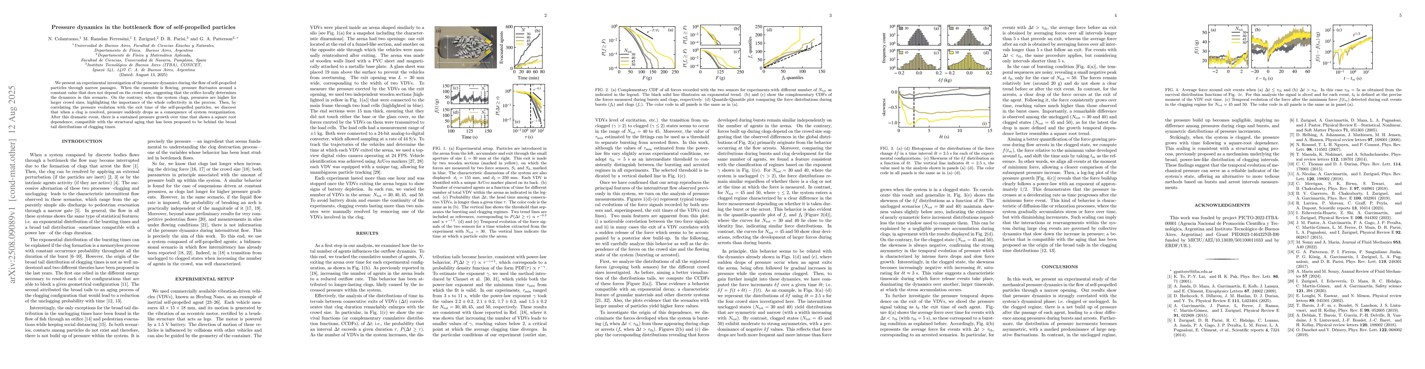 We present an experimental investigation of the pressure dynamics during the flow of self-propelled particles through narrow passages. When the ensemble is flowing, pressure fluctuates around a constant value that does not depend on the crowd size, suggesting that the orifice locally determines the dynamics in this scenario. On the contrary, when the system clogs, pressures are higher for larger crowd sizes, highlighting the importance of the whole collectivity in the process. Then, by correlating the pressure evolution with the exit time of the self-propelled particles, we discover that when a clog is resolved, pressure suddenly drops as a consequence of system reorganization. After this dramatic event, there is a sustained pressure growth over time that shows a square root dependence, compatible with the structural aging that has been proposed to be behind the broad tail distributions of clogging times.