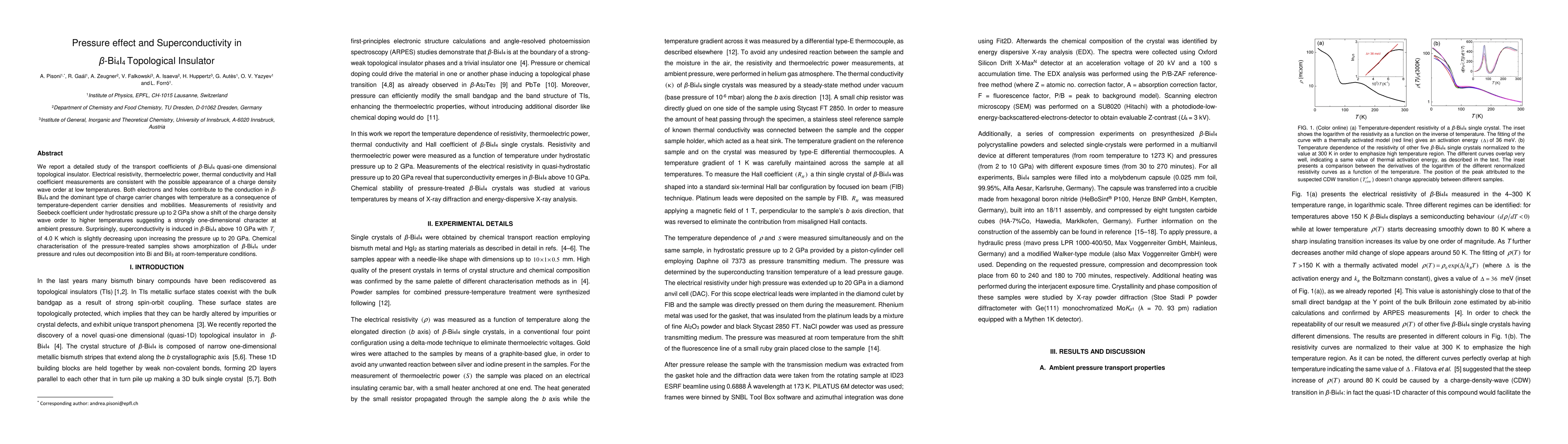 We report a detailed study of the transport coefficients of $\beta$-Bi$_4$I$_4$ quasi-one dimensional topological insulator. Electrical resistivity, thermoelectric power, thermal conductivity and Hall coefficient measurements are consistent with the possible appearance of a charge density wave order at low temperatures. Both electrons and holes contribute to the conduction in $\beta$-Bi$_4$I$_4$ and the dominant type of charge carrier changes with temperature as a consequence of temperature-dependent carrier densities and mobilities. Measurements of resistivity and Seebeck coefficient under hydrostatic pressure up to 2 GPa show a shift of the charge density wave order to higher temperatures suggesting a strongly one-dimensional character at ambient pressure. Surprisingly, superconductivity is induced in $\beta$-Bi$_4$I$_4$ above 10 GPa with of 4.0 K which is slightly decreasing upon increasing the pressure up to 20 GPa. Chemical characterisation of the pressure-treated samples shows amorphization of $\beta$-Bi$_4$I$_4$ under pressure and rules out decomposition into Bi and BiI$_3$ at room-temperature conditions.