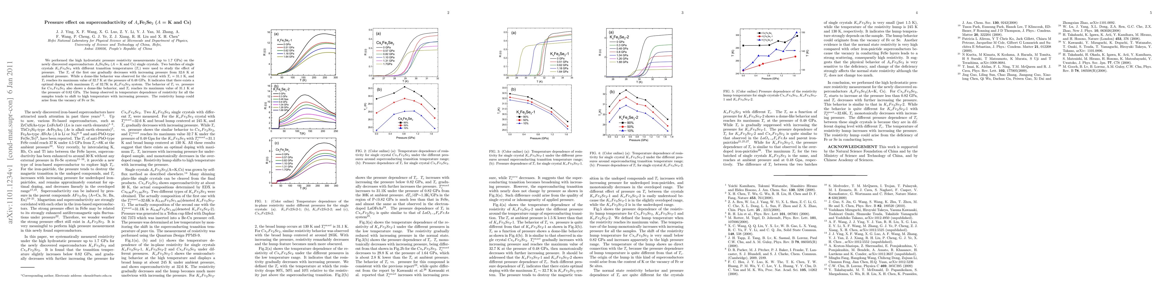 We performed the high hydrostatic pressure resistivity measurements (up to 1.7 GPa) on the newly discovered superconductors $A_{x}$Fe$_2$Se$_2$ ($A$ = K and Cs) single crystals. Two batches of single crystals $K_xFe_2Se_2$ with different transition temperatures ($T_c$) were used to study the effect of pressure. The $T_c$ of the first one gradually decreases with increasing pressure from 32.6 K at ambient pressure. While a dome-like behavior was observed for the crystal with $T_c=31.1$ K, and $T_c$ reaches its maximum value of 32.7 K at the pressure of 0.48 GPa. It indicates that there exists a optimal doping with maximum $T_c$ of 32.7K in $K_xFe_2Se_2$ system. The behavior of $T_c$ vs. pressure for $Cs_xFe_2Se_2$ also shows a dome-like behavior, and $T_c$ reaches its maximum value of 31.1 K at the pressure of 0.82 GPa. The hump observed in temperature dependence of resistivity for all the samples tends to shift to high temperature with increasing pressure. The resistivity hump could arise from the vacancy of Fe or Se.