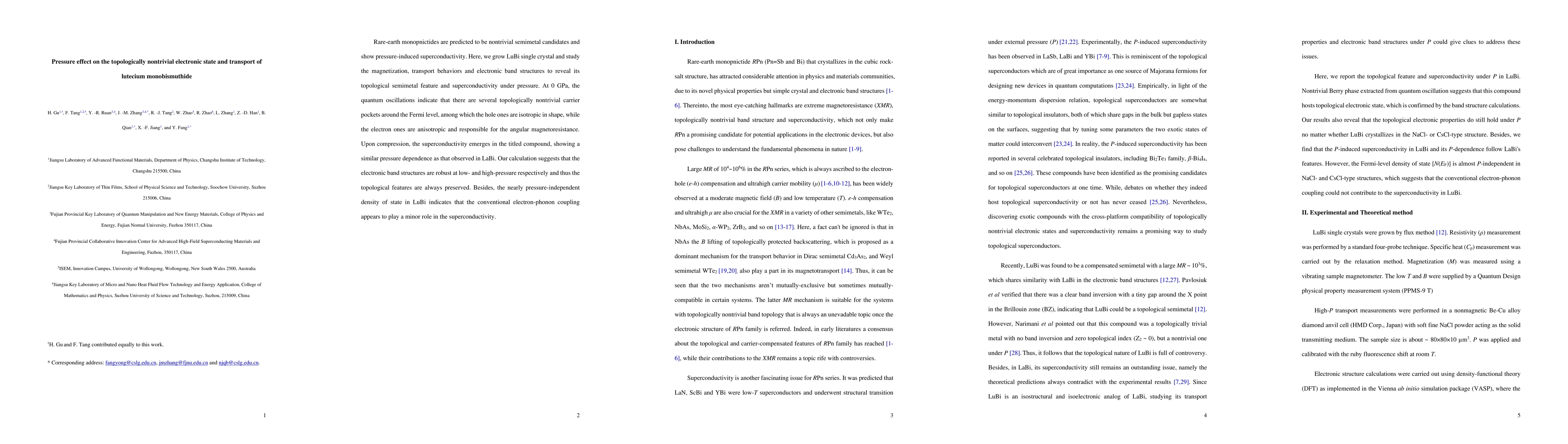 Researchers discovered that lutecium monobismuthide exhibits topological semimetal properties and pressure-induced superconductivity, with its electronic band structures remaining robust under compression.