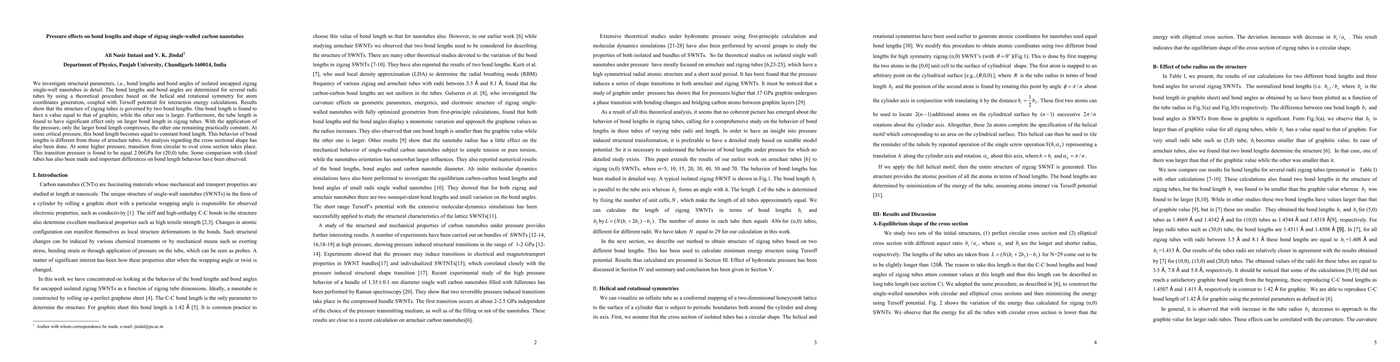 We investigate structural parameters, i.e., bond lengths and bond angles of isolated uncapped zigzag single-wall nanotubes in detail. The bond lengths and bond angles are determined for several radii tubes by using a theoretical procedure based on the helical and rotational symmetry for atom coordinates generation, coupled with Tersoff potential for interaction energy calculations. Results show that the structure of zigzag tubes is governed by two bond lengths. One bond length is found to have a value equal to that of graphite, while the other one is larger. Furthermore, the tube length is found to have significant effect only on larger bond length in zigzag tubes. With the application of the pressure, only the larger bond length compresses, the other one remaining practically constant. At some critical pressure, this bond length becomes equal to constant bond length. This behavior of bond lengths is different from those of armchair tubes. An analysis regarding the cross sectional shape has also been done. At some higher pressure, transition from circular to oval cross section takes place. This transition pressure is found to be equal 2.06GPa for (20,0) tube. Some comparison with chiral tubes has also been made and important differences on bond length behavior have been observed.