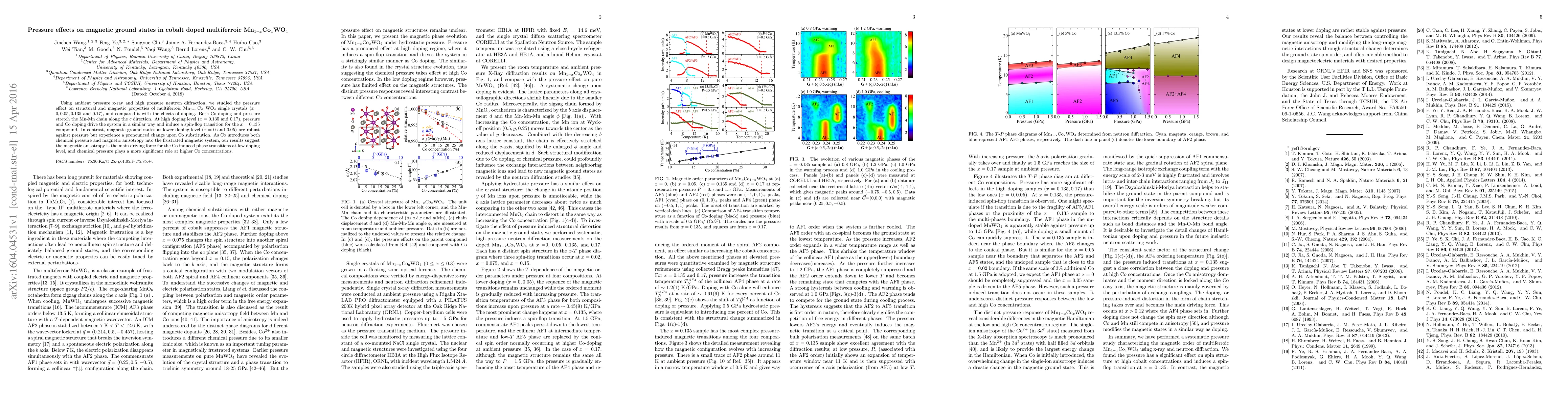 Using ambient pressure x-ray and high pressure neutron diffraction, we studied the pressure effect on structural and magnetic properties of multiferroic Mn$_{1-x}$Co$_x$WO$_4$ single crystals ($x=0, 0.05, 0.135$ and $0.17$), and compared it with the effects of doping. Both Co doping and pressure stretch the Mn-Mn chain along the $c$~direction. At high doping level ($x=0.135$ and $0.17$), pressure and Co doping drive the system in a similar way and induce a spin-flop transition for the $x=0.135$ compound. In contrast, magnetic ground states at lower doping level ($x=0$ and $0.05$) are robust against pressure but experience a pronounced change upon Co substitution. As Co introduces both chemical pressure and magnetic anisotropy into the frustrated magnetic system, our results suggest the magnetic anisotropy is the main driving force for the Co induced phase transitions at low doping level, and chemical pressure plays a more significant role at higher Co concentrations.