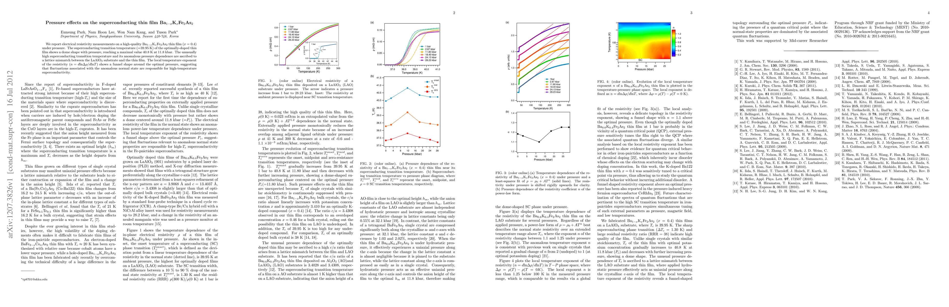This study investigates the pressure effects on the superconducting properties of a Ba$_{1-x}$K$_{x}$Fe$_{2}$As$_{2}$ thin film, finding a dome-shaped superconducting transition temperature peaking at 40.8 K under 11.8 kbar pressure. The high transition temperature and its pressure dependence are attributed to lattice mismatch with the substrate, while fluctuations in the normal state suggest a role in high-temperature superconductivity.