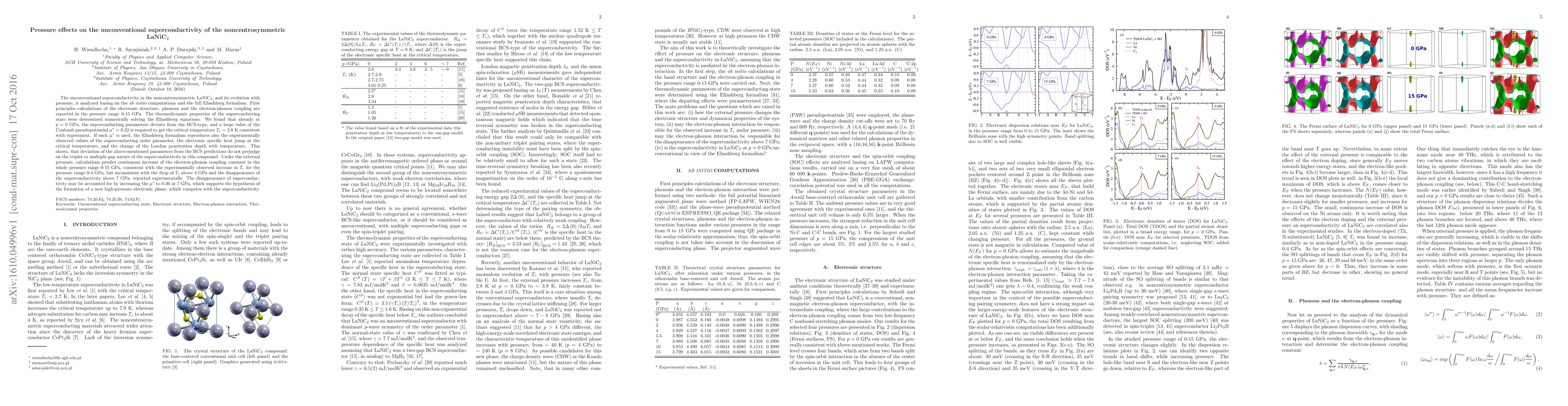 The unconventional superconductivity in the noncentrosymmetric LaNiC$_2$, and its evolution with pressure, is analyzed basing on the {\it ab initio} computations and the full Eliashberg formalism. First principles calculations of the electronic structure, phonons and the electron-phonon coupling are reported in the pressure range 0-15 GPa. The thermodynamic properties of the superconducting state were determined numerically solving the Eliashberg equations. We found that already at $p=0$ GPa, the superconducting parameters deviate from the BCS-type, and a large value of the Coulomb pseudopotential $\mu^{\star}=0.22$ is required to get the critical temperature $T_c = 2.8$~K consistent with experiment. If such $\mu^{\star}$ is used, the Eliashberg formalism reproduces also the experimentally observed values of the superconducting order parameter, the electronic specific heat jump at the critical temperature, and the change of the London penetration depth with temperature. This shows, that deviation of the above-mentioned parameters from the BCS predictions do not prejudge on the triplet or multiple gap nature of the superconductivity in this compound. Under the external pressure, calculations predict continuous increase of the electron-phonon coupling constant in the whole pressure range 0-15~GPa, consistent with the experimentally observed increase in $T_c$ for the pressure range 0-4~GPa, but inconsistent with the drop of $T_c$ above 4~GPa and the disappearance of the superconductivity above 7~GPa, reported experimentally. The disappearance of superconductivity may be accounted for by increasing the $\mu^{\star}$ to 0.36 at 7~GPa, which supports the hypothesis of the formation of a new high-pressure electronic phase, which competes with the superconductivity.