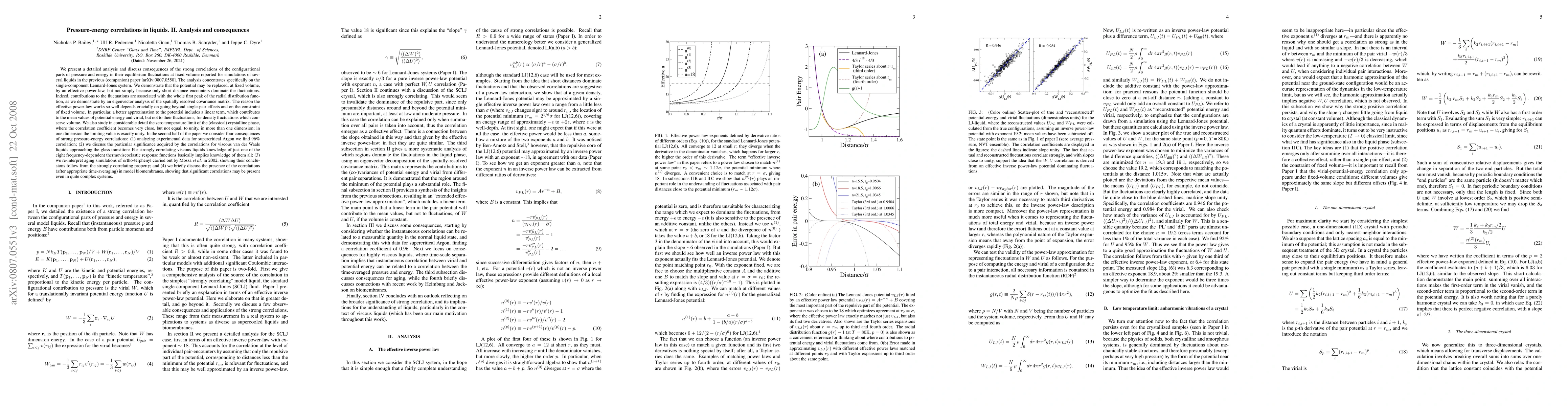 We present an analysis and discuss consequences of the strong correlations of the configurational parts of pressure and energy in their equilibrium fluctuations at fixed volume reported for simulations of several liquids in the companion paper [arXiv:0807.0550]. The analysis concentrates specifically on the single-component Lennard-Jones system. We demonstrate that the potential may be replaced, at fixed volume, by an effective power-law, but not because only short distance encounters dominate the fluctuations. Indeed, contributions to the fluctuations are associated with the whole first peak of the RDF, as we demonstrate by an analysis of the spatially resolved covariance matrix. The reason the effective power-law works so well depends on going beyond single-pair effects and on the constraint of fixed volume. In particular, a better approximation to the potential includes a linear term, which contributes to the mean values of potential energy and virial, but not to their fluctuations. We also study the T=0 limit of the crystalline phase, where the correlation coefficient becomes very close, but not equal, to unity. We then consider four consequences of strong pressure-energy correlations: (1) analyzing experimental data for supercritical Ar we find 96% correlation; (2) we discuss the significance acquired by the correlations for viscous van der Waals liquids approaching the glass transition: For strongly correlating viscous liquids knowledge of just one of the eight frequency-dependent thermoviscoelastic response functions basically implies knowledge of them all; (3) we re-interpret aging simulations of ortho-terphenyl carried out by Mossa {\it et al.} in 2002, showing their conclusions follow from the strongly correlating property; and (4) we discuss correlations in model biomembranes.