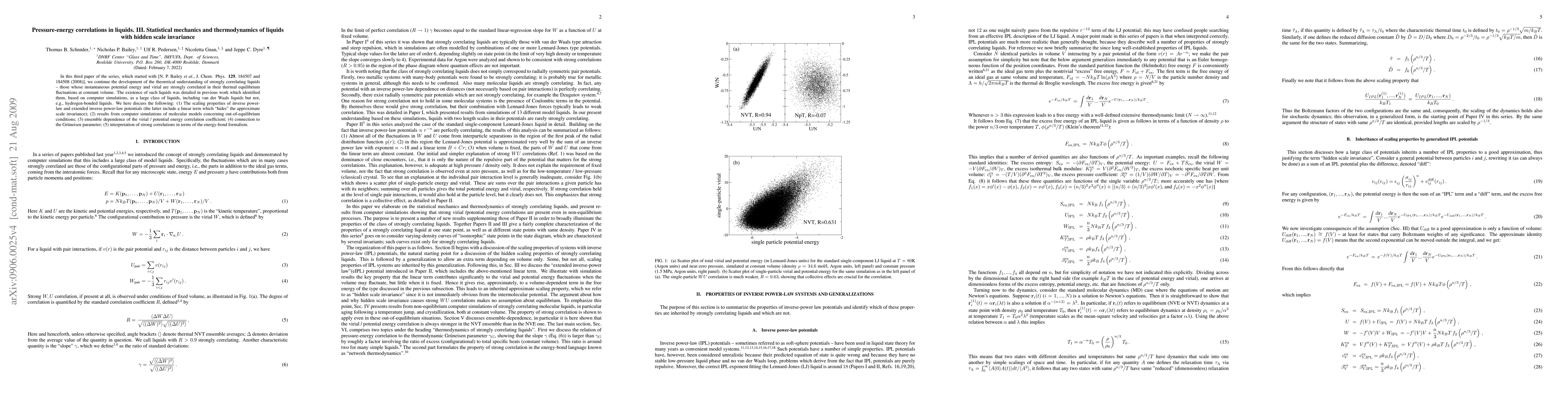 In this third paper of the series, which started with [N. P. Bailey et al., J. Chem. Phys. 129, 184507 and 184508 (2008)], we continue the development of the theoretical understanding of strongly correlating liquids - those whose instantaneous potential energy and virial are strongly correlated in their thermal equilibrium fluctuations at constant volume. The existence of such liquids was detailed in previous work which identified them, based on computer simulations, as a large class of liquids, including van der Waals liquids but not, e.g., hydrogen-bonded liquids. We here discuss the following: (1) The scaling properties of inverse power-law and extended inverse power-law potentials (the latter include a linear term which "hides" the approximate scale invariance); (2) results from computer simulations of molecular models concerning out-of-equilibrium conditions; (3) ensemble dependence of the virial / potential energy correlation coefficient; (4) connection to the Gruneisen parameter; (5) interpretation of strong correlations in terms of the energy-bond formalism.