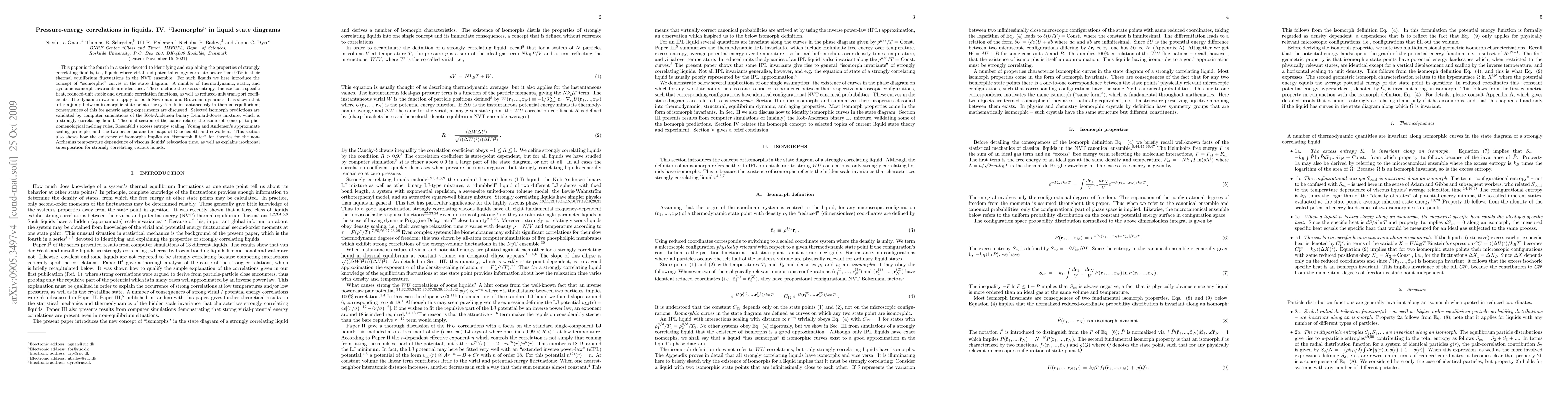 This paper is the fourth in a series devoted to identifying and explaining the properties of strongly correlating liquids, i.e., liquids where virial and potential energy correlate better than 90% in their thermal equilibrium fluctuations in the NVT ensemble. For such liquids we here introduce the concept of "isomorphic" curves in the state diagram. A number of thermodynamic, static, and dynamic isomorph invariants are identified. These include the excess entropy, the isochoric specific heat, reduced-unit static and dynamic correlation functions, as well as reduced-unit transport coefficients. The dynamic invariants apply for both Newtonian and Brownian dynamics. It is shown that after a jump between isomorphic state points the system is instantaneously in thermal equilibrium; consequences of this for generic aging experiments are discussed. Selected isomorph predictions are validated by computer simulations of the Kob-Andersen binary Lennard-Jones mixture, which is a strongly correlating liquid. The final section of the paper relates the isomorph concept to phenomenological melting rules, Rosenfeld's excess entropy scaling, Young and Andersen's approximate scaling principle, and the two-order parameter maps of Debenedetti and coworkers. This section also shows how the existence of isomorphs implies an "isomorph filter" for theories for the non-Arrhenius temperature dependence of viscous liquids' relaxation time, as well as explains isochronal superposition for strongly correlating viscous liquids.
