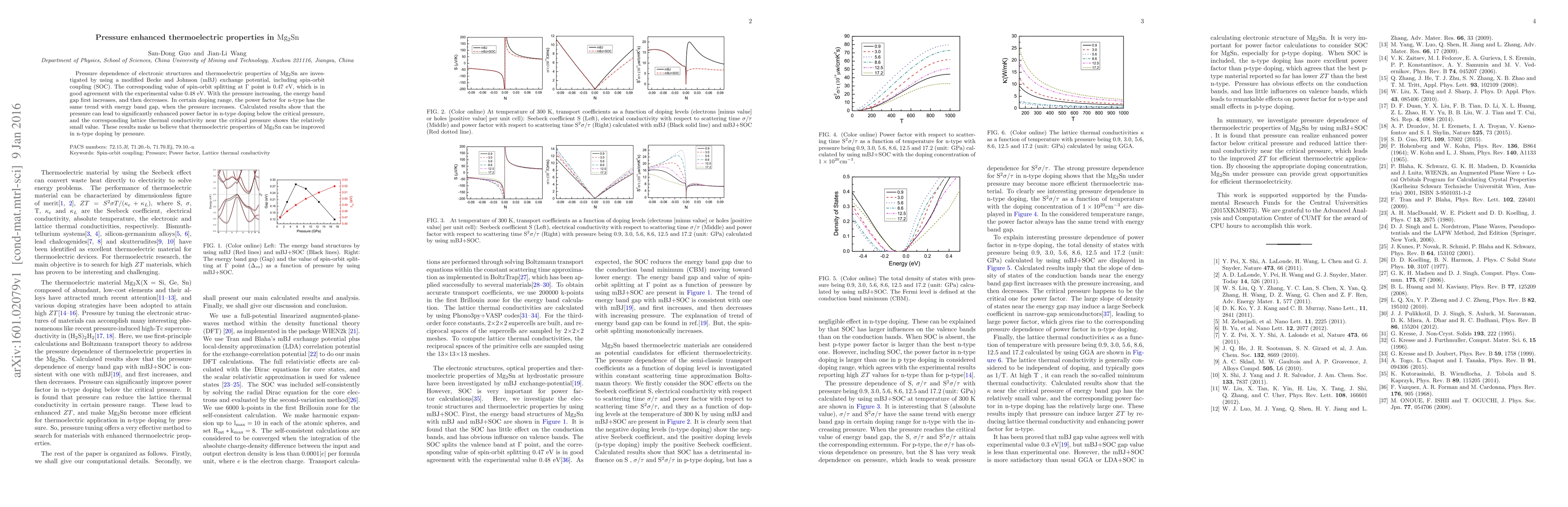 Pressure dependence of electronic structures and thermoelectric properties of $\mathrm{Mg_2Sn}$ are investigated by using a modified Becke and Johnson (mBJ) exchange potential, including spin-orbit coupling (SOC). The corresponding value of spin-orbit splitting at $\Gamma$ point is 0.47 eV, which is in good agreement with the experimental value 0.48 eV. With the pressure increasing, the energy band gap first increases, and then decreases. In certain doping range, the power factor for n-type has the same trend with energy band gap, when the pressure increases. Calculated results show that the pressure can lead to significantly enhanced power factor in n-type doping below the critical pressure, and the corresponding lattice thermal conductivity near the critical pressure shows the relatively small value. These results make us believe that thermoelectric properties of $\mathrm{Mg_2Sn}$ can be improved in n-type doping by pressure.