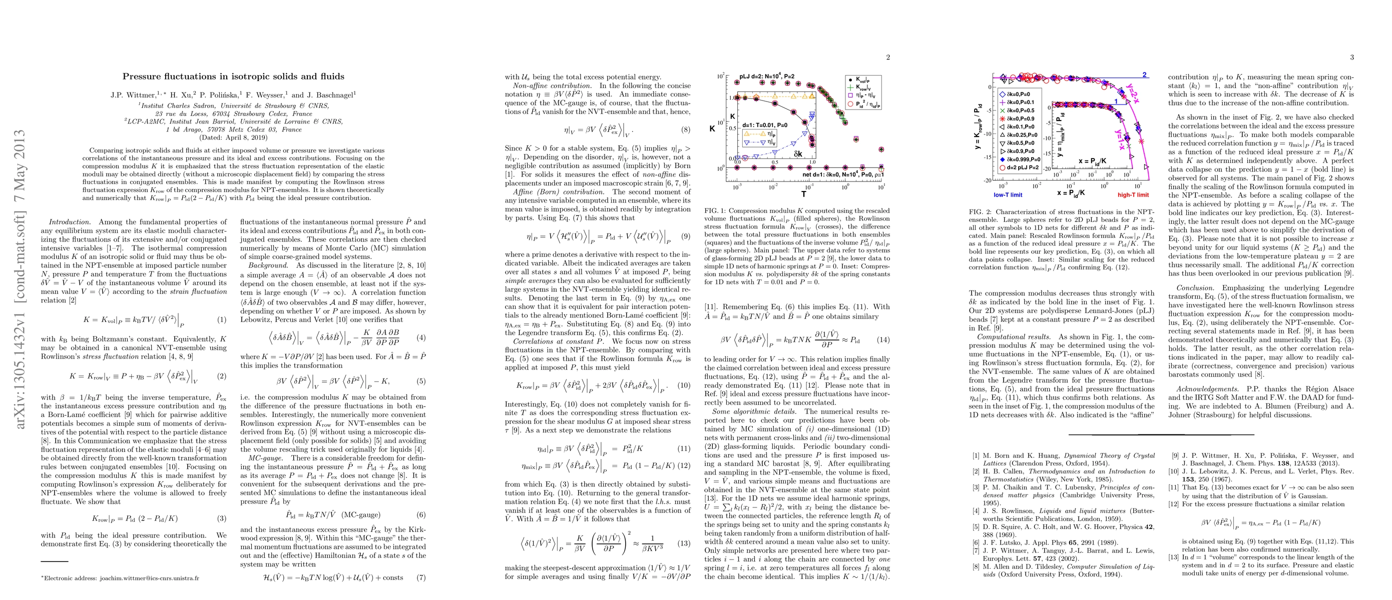 This paper investigates pressure fluctuations in isotropic solids and fluids under volume or pressure constraints, demonstrating that the compression modulus can be derived directly from stress fluctuations without a microscopic displacement field. The theoretical and numerical results show that the Rowlinson expression for the compression modulus correlates with the ideal pressure contribution.