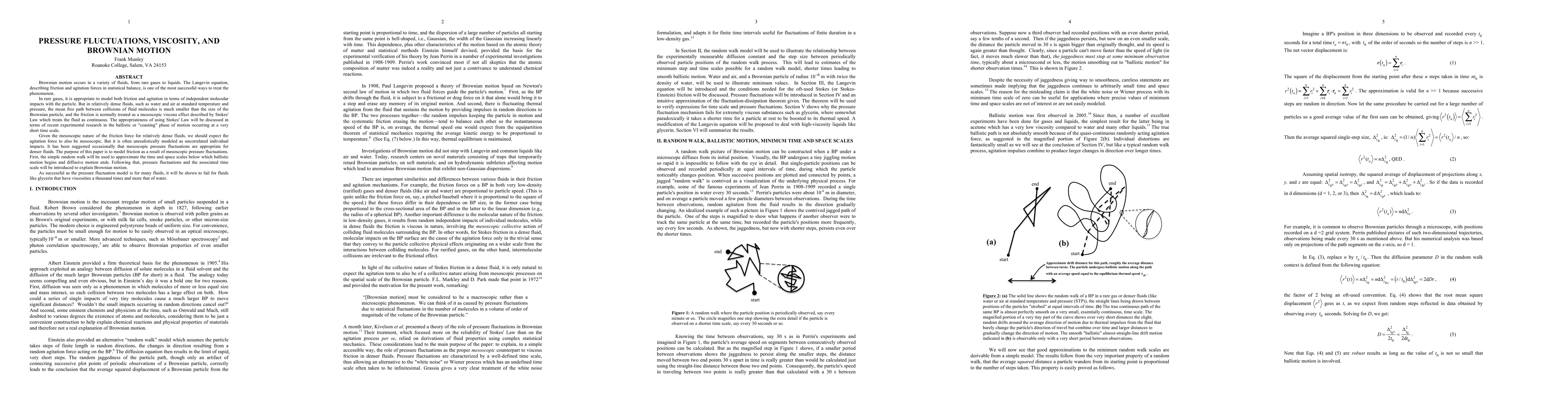 Brownian motion occurs in a variety of fluids, from rare gases to liquids. The Langevin equation, describing friction and agitation forces in statistical balance, is one of the most successful ways to treat the phenomenon. In rare gases, it is appropriate to model both friction and agitation in terms of independent molecular impacts with the particle. But in relatively dense fluids, such as water and air at standard temperature and pressure, the mean free path between collisions of fluid molecules is much smaller than the size of the Brownian particle, and the friction is normally treated as a mesoscopic viscous effect described by Stokes' Law which treats the fluid as continuous. The appropriateness of using Stokes' Law will be discussed in terms of recent experimental research in the ballistic or "coasting" phase of motion occurring at a very short time scale. Given the mesoscopic nature of the friction force for relatively dense fluids, we should expect the agitation force to also be mesoscopic. But it is often unrealistically modeled as uncorrelated individual impacts. It has been suggested occasionally that mesoscopic pressure fluctuations are appropriate for denser fluids. The purpose of this paper is to model friction as a result of mesoscopic pressure fluctuations. First, the simple random walk will be used to approximate the time and space scales below which ballistic motion begins and diffusive motion ends. Following that, pressure fluctuations and the associated time scale will be introduced to explain Brownian motion. As successful as the pressure fluctuation model is for many fluids, it will be shown to fail for fluids like glycerin that have viscosities a thousand times and more that of water.