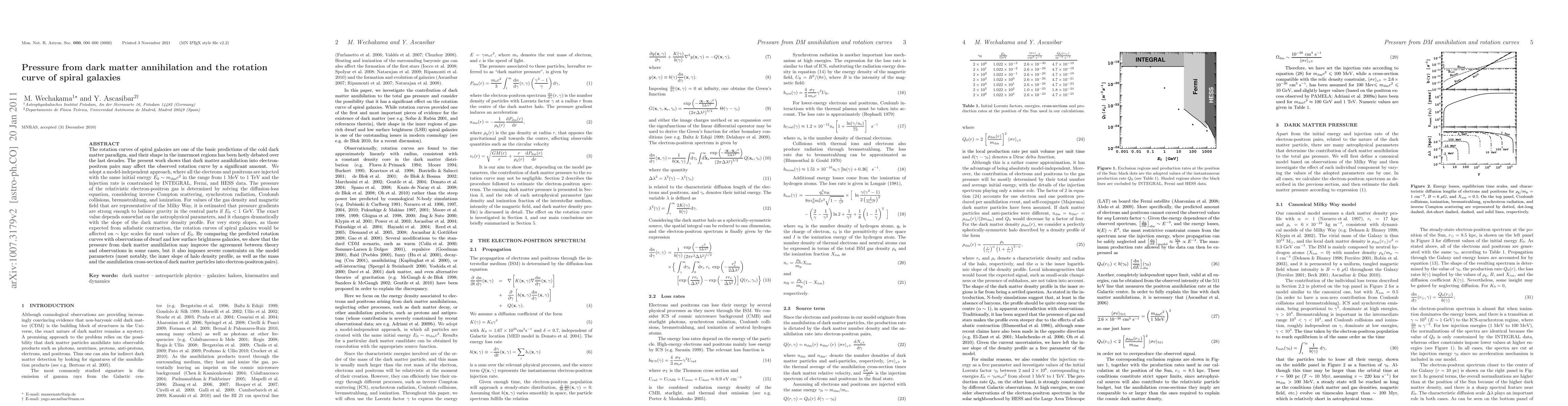 This research explores the impact of dark matter annihilation into electron-positron pairs on the rotation curves of spiral galaxies. Using a model-independent method, it estimates that pressure from this process could significantly alter the curves, particularly in the central regions. The findings suggest that for lower initial electron-positron energies, this pressure can balance gravity, influencing galaxy rotation on kpc scales. Comparing with observations of dwarf and low surface brightness galaxies, the study indicates that while this mechanism might reconcile theory with observations in some cases, it also imposes strict constraints on dark matter halo properties and annihilation cross-sections.