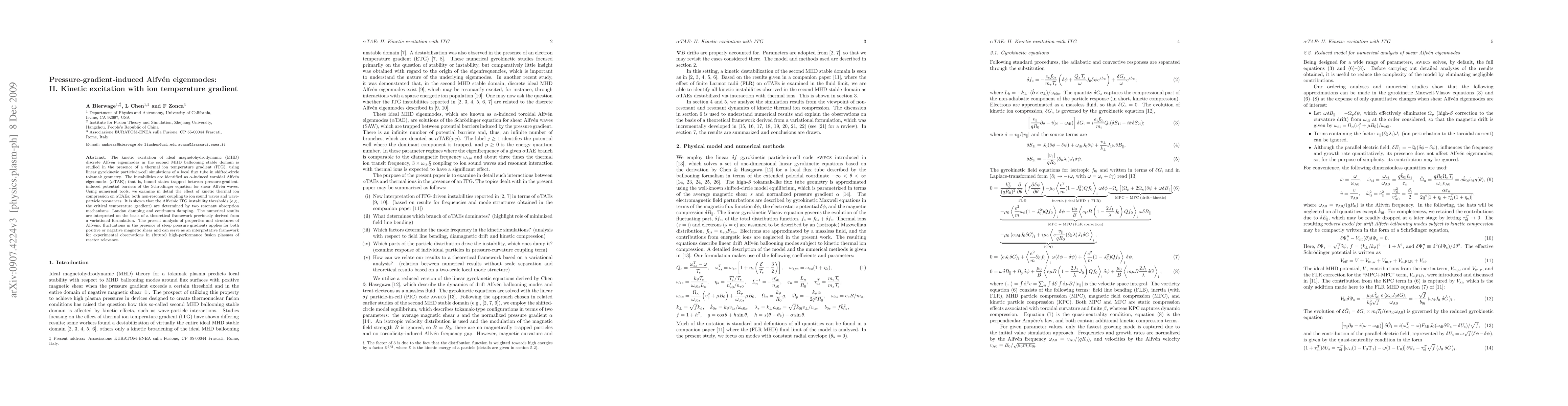 This paper investigates the kinetic excitation of Alfven eigenmodes in the presence of an ion temperature gradient using gyrokinetic simulations, identifying them as alpha-induced toroidal Alfven eigenmodes. The study reveals that the instability thresholds are determined by Landau damping and continuum damping, providing a theoretical framework for interpreting Alfvenic fluctuations in fusion plasmas.