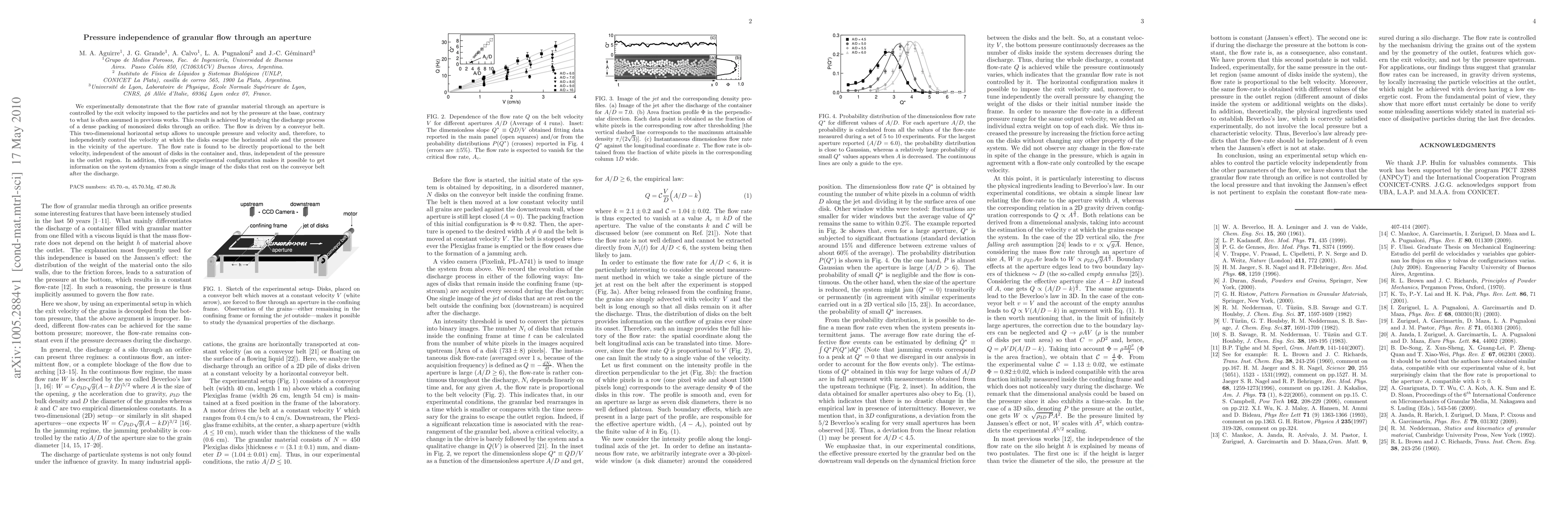This study experimentally shows that the flow rate of granular material through an aperture is determined by the exit velocity rather than the pressure at the base, using a conveyor belt to drive monosized disks through an orifice. The results indicate a direct proportionality between flow rate and belt velocity, independent of pressure and the number of disks.