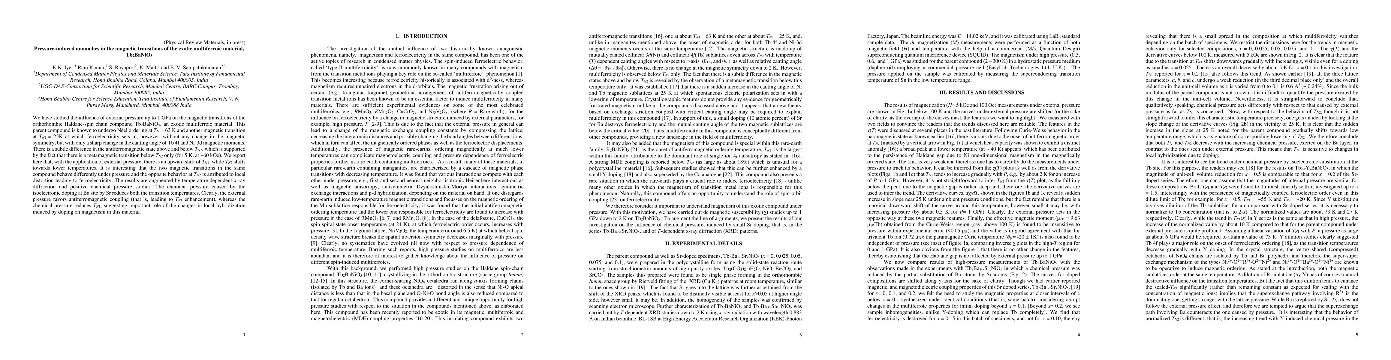 We have studied the influence of external pressure up to 1 GPa on the magnetic transitions of the orthorhombic Haldane-spin chain compound Tb2BaNiO5 an exotic multiferroic material. This parent compound is known to undergo N\'eel ordering at TN1= 63 K and another magnetic transition at TN2= 25K at which ferroelectricity sets in, however, without any change in the magnetic symmetry, but with only a sharp change in the canting angle of Tb 4f and Ni 3d magnetic moments. There is a subtle difference in the antiferromagnetic state above and below TN2, which is supported by the fact that there is a metamagnetic transition below TN2only (for 5 K, at about 60 kOe). We report here that, with the application of external pressure, there is an upward shift of TN1, while TN2 shifts towards lower temperatures. It is interesting that the two magnetic transitions in the same compound behave differently under pressure and the opposite behavior at TN2 is attributed to local distortion leading to ferroelectricity. The results are augmented by temperature dependent x-ray diffraction and positive chemical pressure studies. The chemical pressure caused by the isoelectronic doping at Ba site by Sr reduces both the transition temperatures. Clearly, the external pressure favors antiferromagnetic coupling (that is, leading to TN1 enhancement), whereas the chemical pressure reduces TN1, suggesting important role of the changes in local hybridization induced by doping on magnetism in this material.