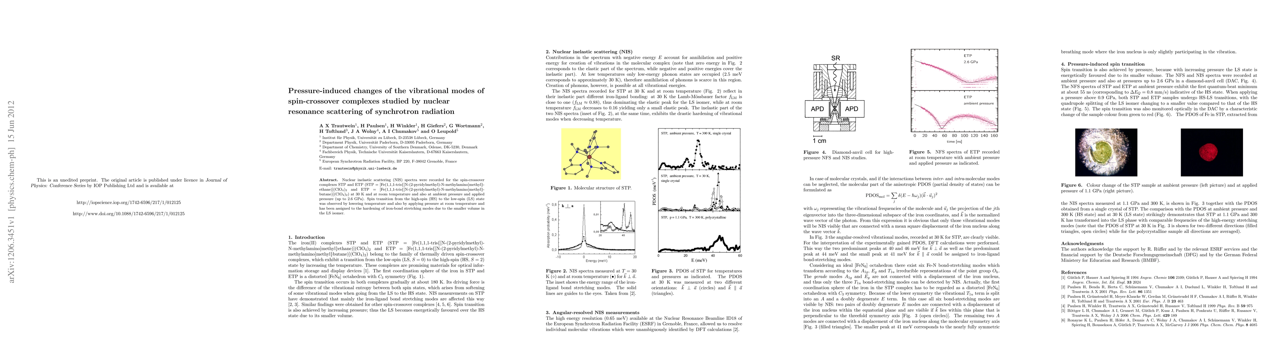 This study investigates the pressure-induced spin-crossover in STP and ETP complexes using nuclear inelastic scattering. The spin transition from high-spin to low-spin states is observed both thermally and under pressure, attributed to the hardening of iron-bond stretching modes due to reduced volume in the low-spin state.