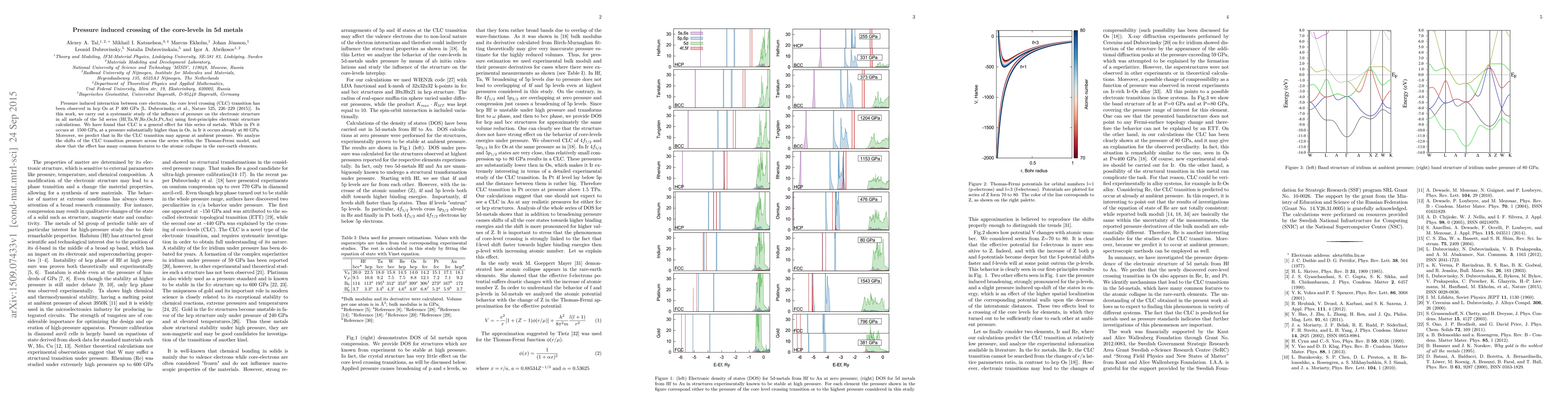 Pressure induced interaction between core electrons, the core level crossing (CLC) transition has been observed in hcp Os at P~400 GPa [L. Dubrovinksy, et al., Nature 525, 226-229 (2015)]. In this work, we carry out a systematic study of the influence of pressure on the electronic structure in all metals of the 5d series (Hf,Ta,W,Re,Os,Ir,Pt,Au) using first-principles electronic structure calculations. We have found that CLC is a general effect for this series of metals. While in Pt it occurs at ~1500 GPa, at a pressure substantially higher than in Os, in Ir it occurs already at 80 GPa. Moreover, we predict that in Re the CLC transition may appear at ambient pressure. We analyze the shifts of the CLC transition pressure across the series within the Thomas-Fermi model, and show that the effect has many common features to the atomic collapse in the rare-earth elements.