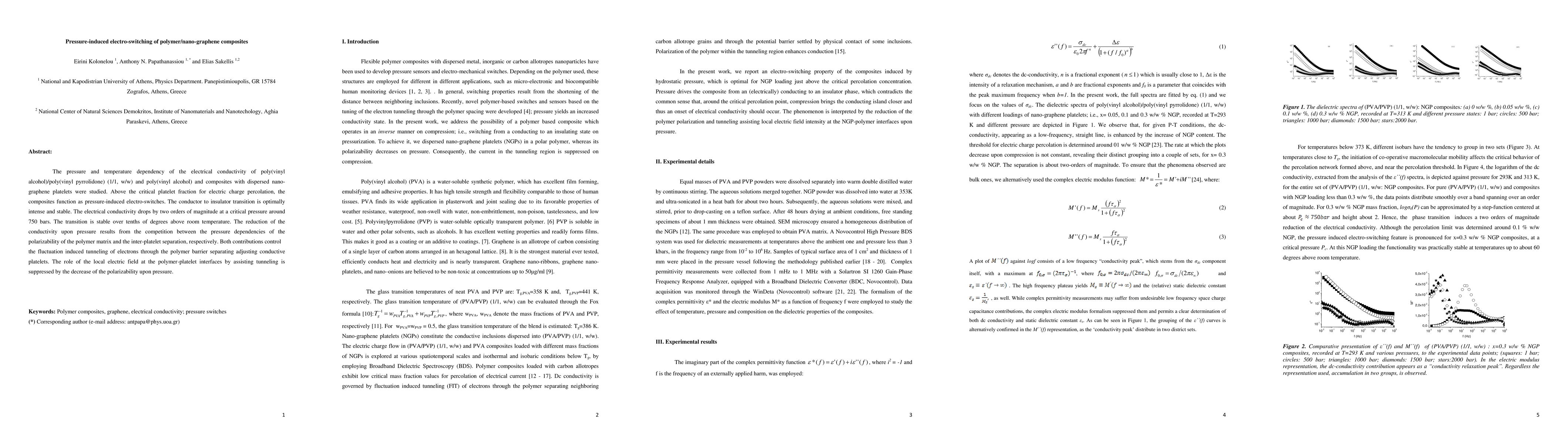 The pressure and temperature dependency of the electrical conductivity of poly(vinyl alcohol)/poly(vinyl pyrrolidone) (1/1, w/w) and poly(vinyl alcohol) and composites with dispersed nano-graphene platelets were studied. Above the critical platelet fraction for electric charge percolation, the composites function as pressure-induced electro-switches. The conductor to insulator transition is optimally intense and stable. The electrical conductivity drops by two orders of magnitude at a critical pressure around 750 bars. The transition is stable over tenths of degrees above room temperature. The reduction of the conductivity upon pressure results from the competition between the pressure dependencies of the polarizability of the polymer matrix and the inter-platelet separation, respectively. Both contributions control the fluctuation induced tunneling of electrons through the polymer barrier separating adjusting conductive platelets. The role of the local electric field at the polymer-platelet interfaces by assisting tunneling is suppressed by the decrease of the polarizability upon pressure.