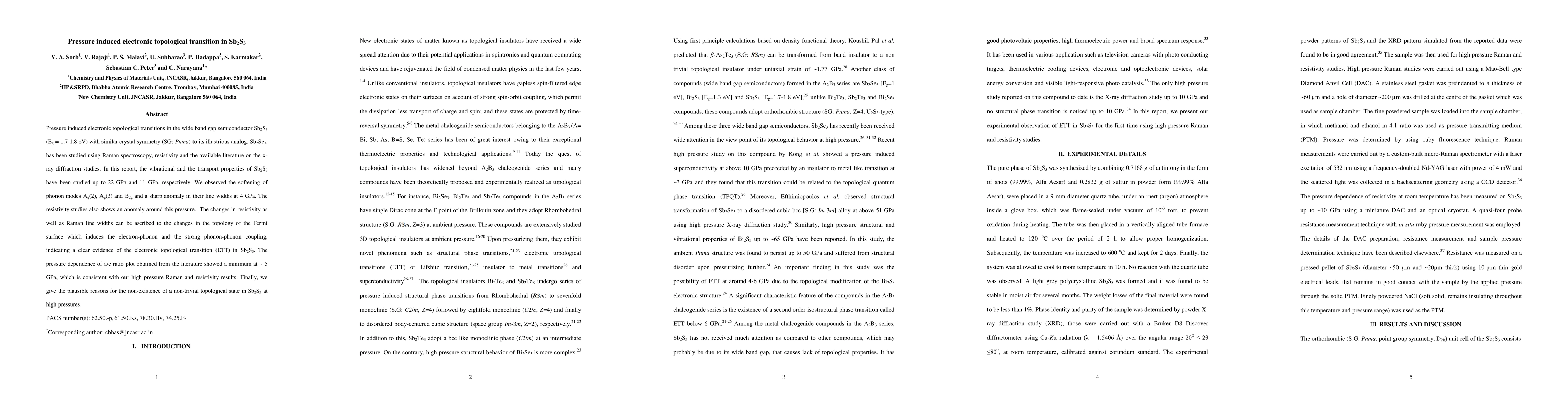 Pressure induced electronic topological transitions in the wide band gap semiconductor Sb2S3 (Eg = 1.7-1.8 eV) with similar crystal symmetry (SG: Pnma) to its illustrious analog, Sb2Se3, has been studied using Raman spectroscopy, resistivity and the available literature on the x-ray diffraction studies. In this report, the vibrational and the transport properties of Sb2S3 have been studied up to 22 GPa and 11 GPa, respectively. We observed the softening of phonon modes Ag(2), Ag(3) and B2g and a sharp anomaly in their line widths at 4 GPa. The resistivity studies also shows an anomaly around this pressure. The changes in resistivity as well as Raman line widths can be ascribed to the changes in the topology of the Fermi surface which induces the electron-phonon and the strong phonon-phonon coupling, indicating a clear evidence of the electronic topological transition (ETT) in Sb2S3. The pressure dependence of a/c ratio plot obtained from the literature showed a minimum at ~ 5 GPa, which is consistent with our high pressure Raman and resistivity results. Finally, we give the plausible reasons for the non-existence of a non-trivial topological state in Sb2S3 at high pressures.