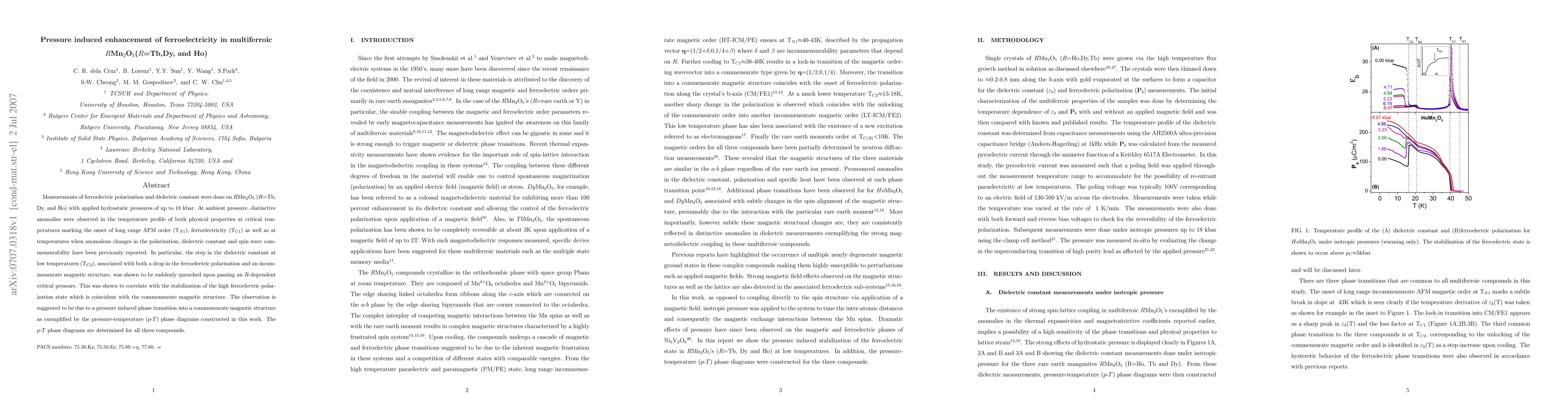 The novelty of this work lies in its comprehensive analysis of pressure effects on ferroelectric and magnetic transitions in $R$Mn$_2$O$_5$, revealing pressure-induced stabilization of high ferroelectric polarization states correlated with commensurate magnetic structures.