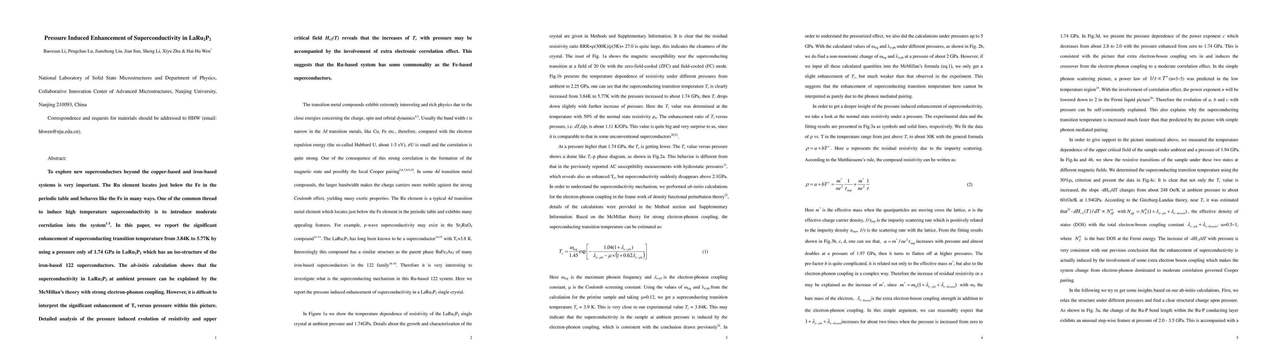To explore new superconductors beyond the copper-based and iron-based systems is very important. The Ru element locates just below the Fe in the periodic table and behaves like the Fe in many ways. One of the common thread to induce high temperature superconductivity is to introduce moderate correlation into the system. In this paper, we report the significant enhancement of superconducting transition temperature from 3.84K to 5.77K by using a pressure only of 1.74 GPa in LaRu2P2 which has an iso-structure of the iron-based 122 superconductors. The ab-initio calculation shows that the superconductivity in LaRu2P2 at ambient pressure can be explained by the McMillan's theory with strong electron-phonon coupling. However, it is difficult to interpret the significant enhancement of Tc versus pressure within this picture. Detailed analysis of the pressure induced evolution of resistivity and upper critical field Hc2(T) reveals that the increases of Tc with pressure may be accompanied by the involvement of extra electronic correlation effect. This suggests that the Ru-based system has some commonality as the Fe-based superconductors.