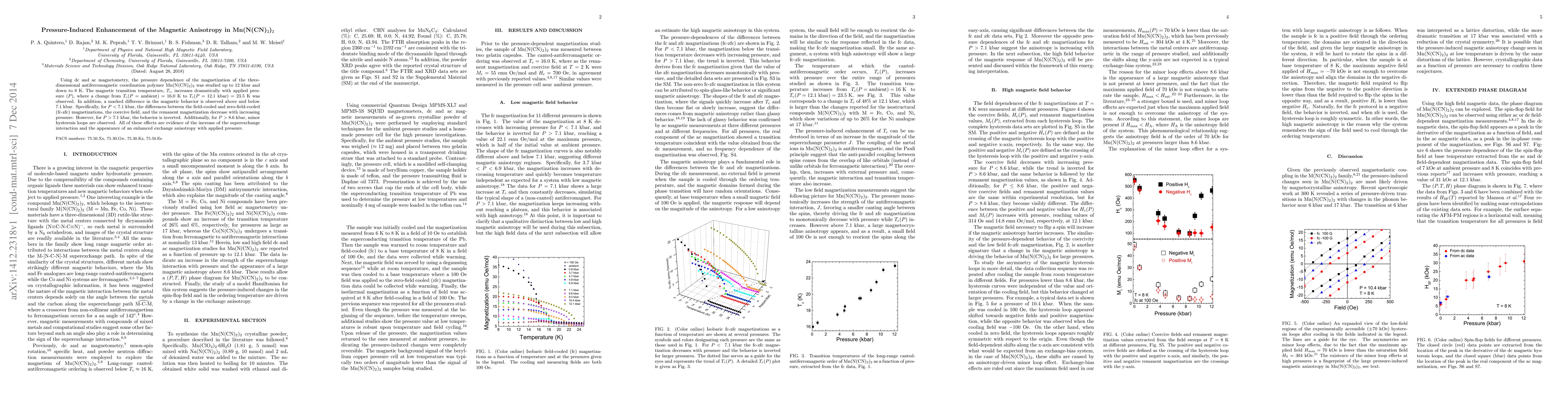 Using dc and ac magnetometry, the pressure dependence of the magnetization of the three-dimensional antiferromagnetic coordination polymer Mn(N(CN)$_{2}$)$_{2}$ was studied up to 12 kbar and down to 8K. The magnetic transition temperature, $T_c$, increases dramatically with applied pressure $(P)$, where a change from $T_c(P=\text{ambient}) = 16.0$ K to $T_c(P=12.1$~kbar$) = 23.5$ K was observed. In addition, a marked difference in the magnetic behavior is observed above and below 7.1 kbar. Specifically, for $P<7.1$ kbar, the differences between the field-cooled and zero-field-cooled (fc-zfc) magnetizations, the coercive field, and the remanent magnetization decrease with increasing pressure. However, for $P>7.1$ kbar, the behavior is inverted. Additionally, for $P>8.6$ kbar, minor hysteresis loops are observed. All of these effects are evidence of the increase of the superexchange interaction and the appearance of an enhanced exchange anisotropy with applied pressure.