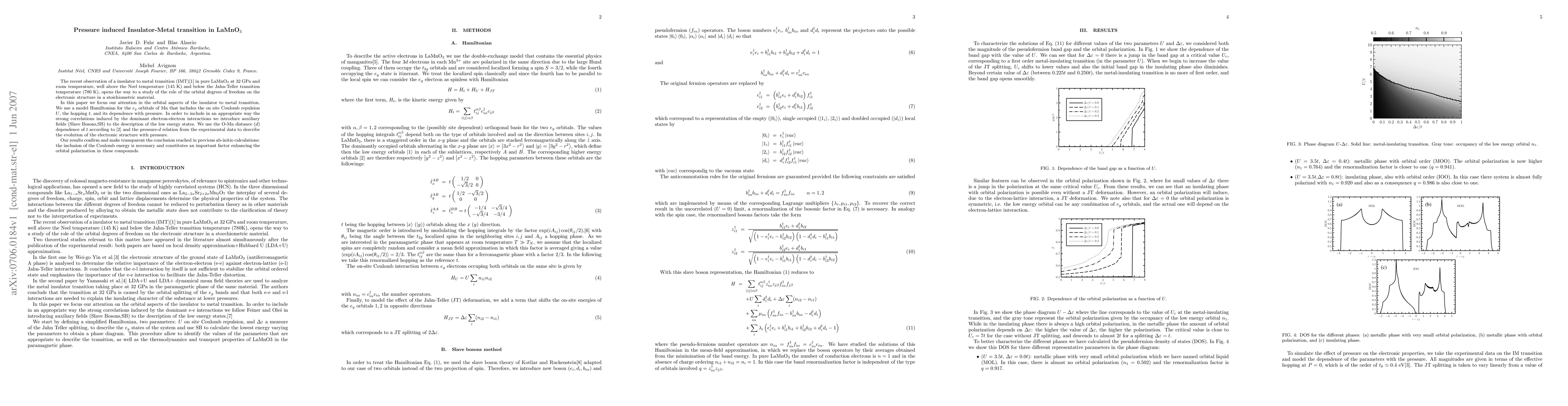 The recent observation of a insulator to metal transition (IMT) [I. Loa et al, PRL 87, 125501 (2001)] in pure LaMnO$_3$ at 32 GPa and room temperature, well above the Neel temperature (145 K) and below the Jahn-Teller transition temperature (780 K), opens the way to a study of the role of the orbital degrees of freedom on the electronic structure in a stoichiometric material. In this paper we focus our attention in the orbital aspects of the insulator to metal transition. We use a model Hamiltonian for the $e_g$ orbitals of Mn that includes the on site Coulomb repulsion $U$, the hopping $t$, and its dependence with pressure. In order to include in an appropriate way the strong correlations induced by the dominant electron-electron interactions we introduce auxiliary fields (Slave Bosons,SB) to the description of the low energy states. We use a O-Mn distance ($d$) dependence of $t$ and the pressure-$d$ relation from the experimental data to describe the evolution of the electronic structure with pressure. Our results confirm and make transparent the conclusion reached in previous ab-initio calculations: the inclusion of the Coulomb energy is necessary and constitutes an important factor enhancing the orbital polarization in these compounds.