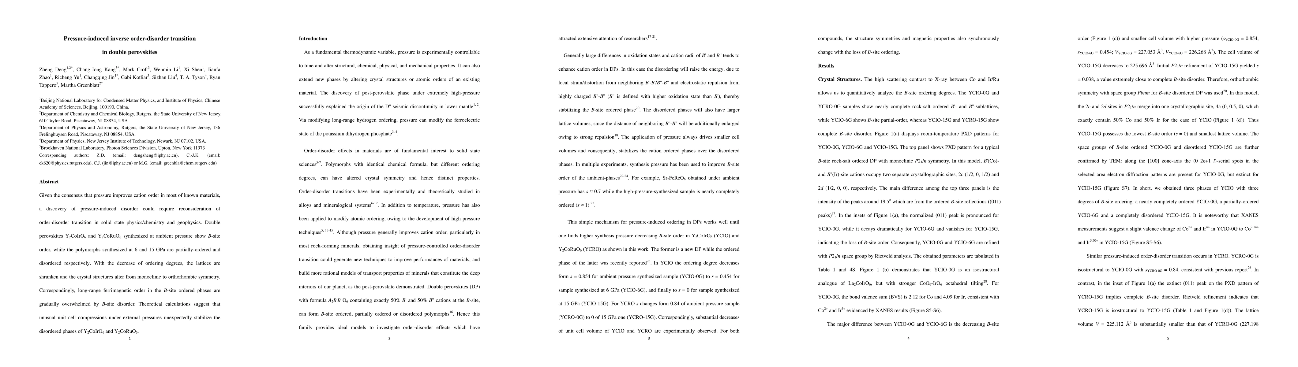 This study reveals a pressure-induced inverse order-disorder transition in double perovskites Y2CoIrO6 and Y2CoRuO6, challenging the conventional belief that pressure typically enhances cation order. The materials transition from ordered to disordered phases under increasing pressure, accompanied by structural changes and the disruption of ferrimagnetic order.