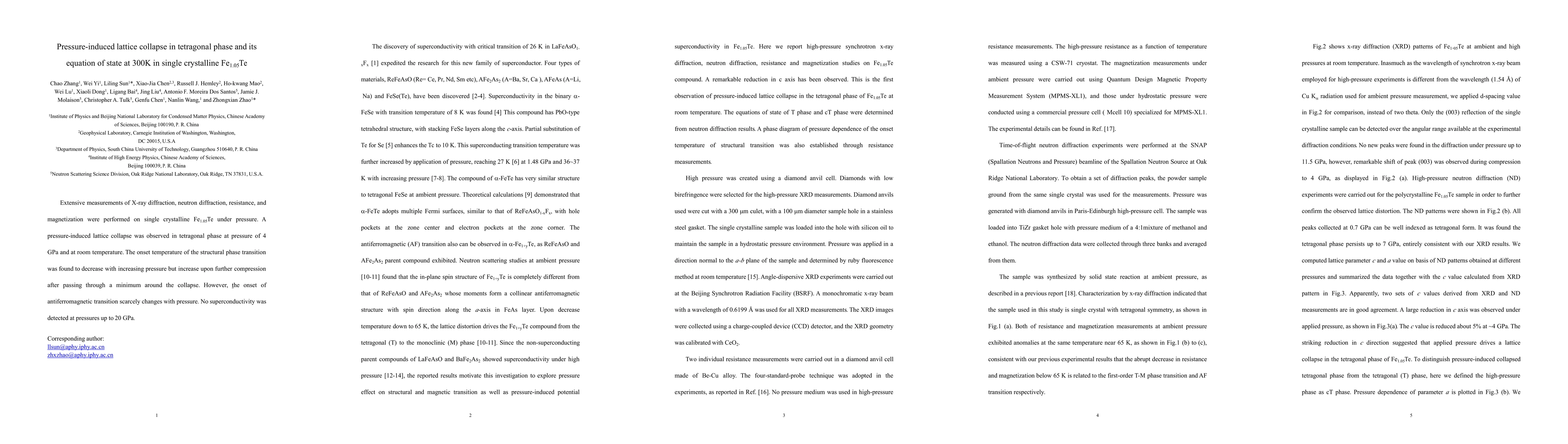 This study investigates the high-pressure behavior of Fe1.05Te using in-situ x-ray diffraction and resistance measurements, revealing a lattice collapse at 4 GPa transitioning from tetragonal to monoclinic phases, with no superconductivity observed. The structural phase transition temperature decreases with pressure until 4 GPa, after which it increases.